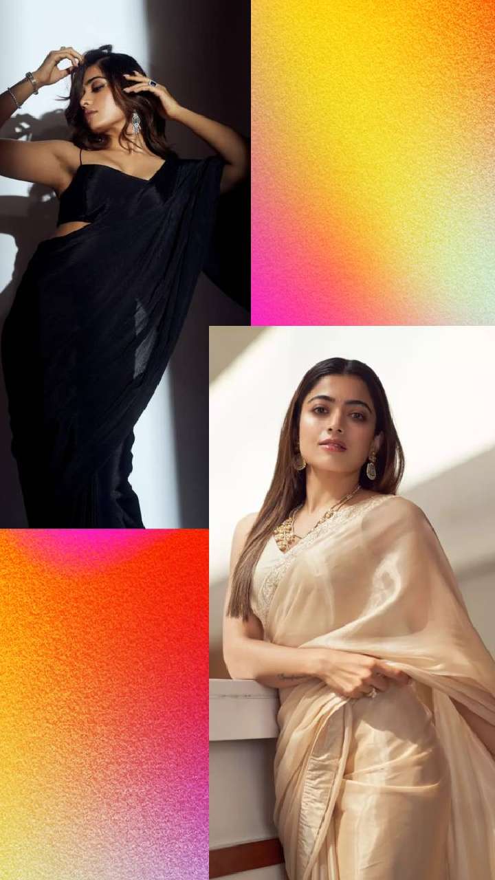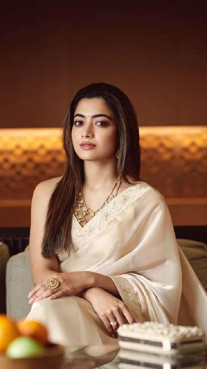 क्रीम कलर की सिल्क साड़ी और स्लीवलेस ब्लाउज में रश्मिका बेहद ग्लैमरस लुक देती नजर आ रही है।