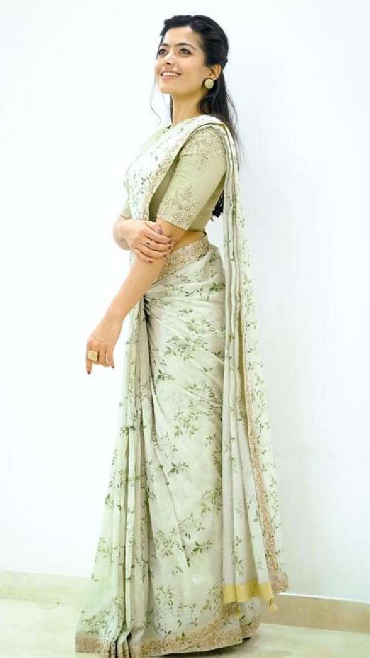 रश्मिका ग्रीन कलर की फ्लोरल प्रिंटेड साड़ी और विद स्लीव ब्लाउज में बला की खूबसूरत लग रही है।