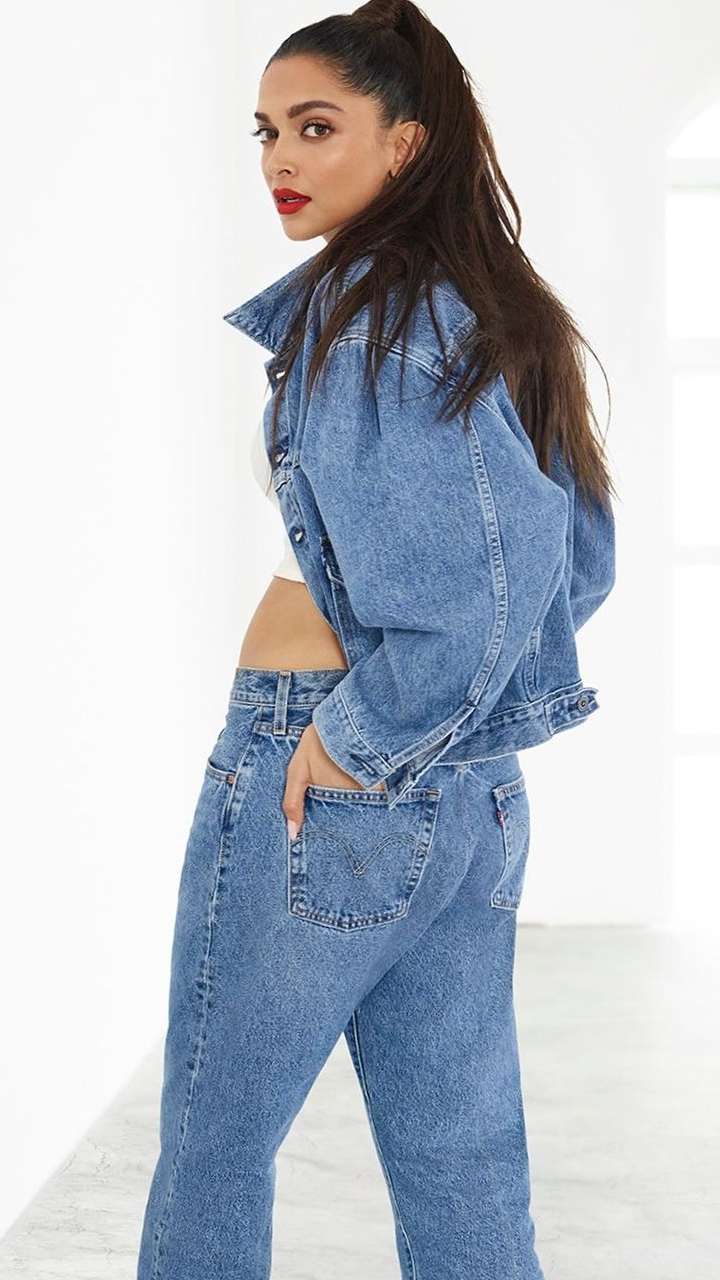 फैशनिस्टा दीपिका पादुकोण ने ब्लू डेनिम जैकेट और जींस के साथ व्हाइट क्रॉप टॉप कैरी किया है।