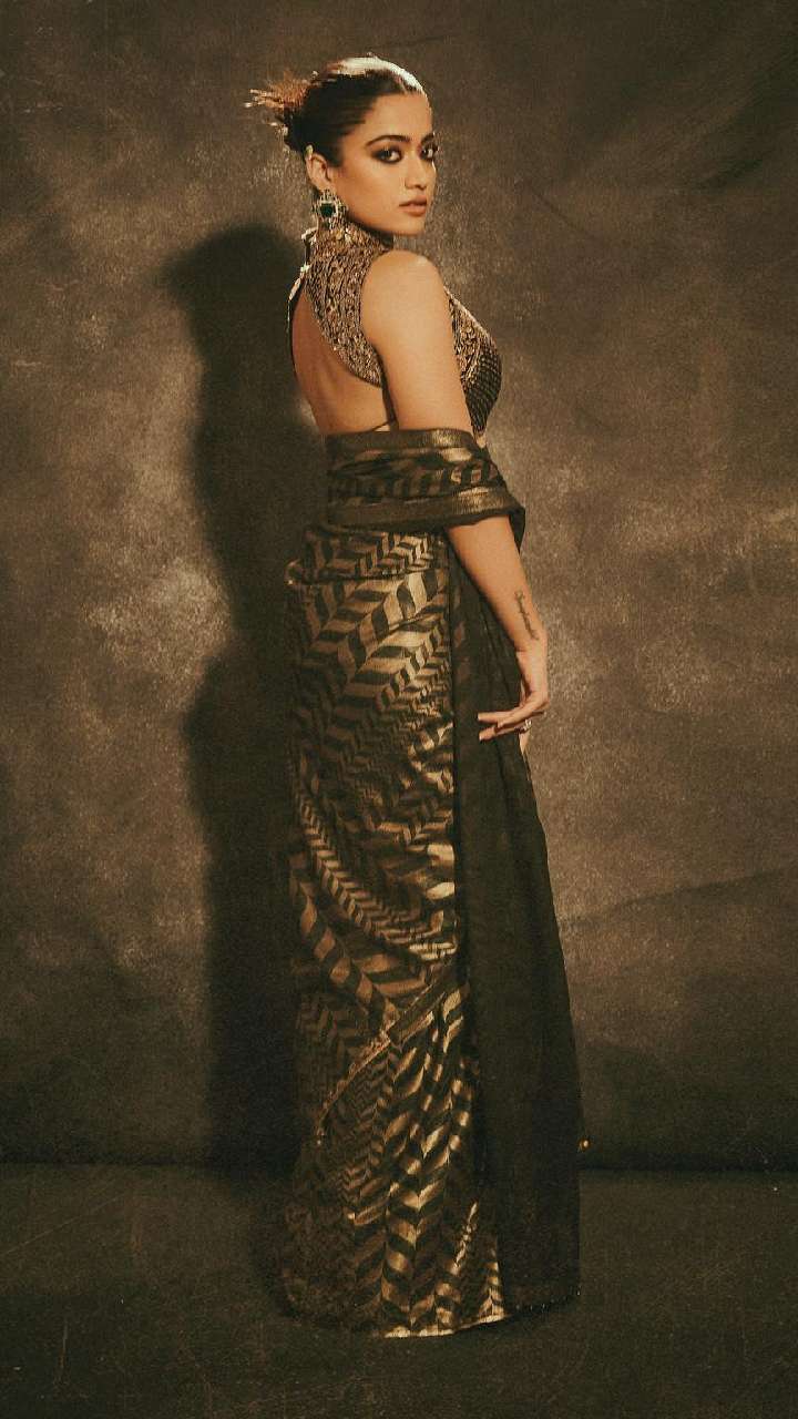 इस गोल्डन ब्लैक सिल्क साड़ी बैकलेस ब्लाउज में एक्ट्रेस बेहद गॉर्जियस नजर आ रही हैं। ये लुक वेडिंग के लिए बेस्ट है।