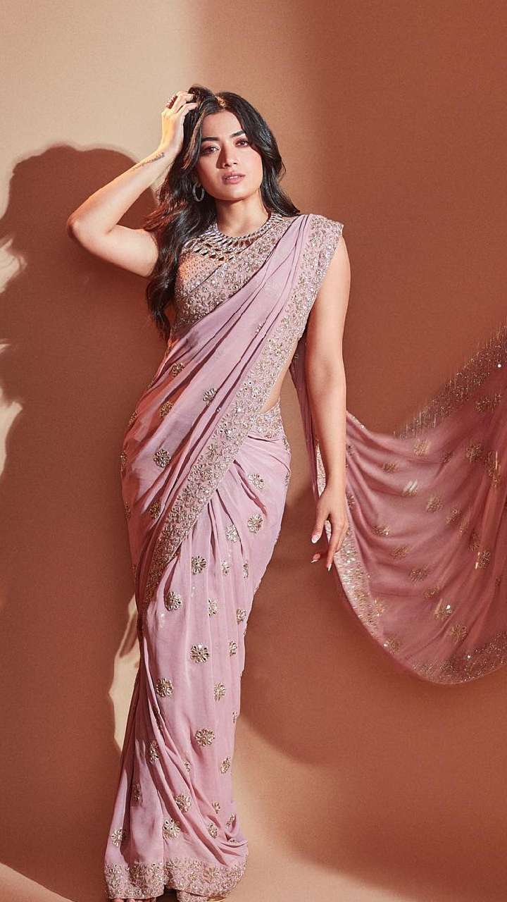 अगर आप पार्टी या फिर रिसेप्शन पार्टी के लिए साड़ी देख रहीं हैं तो आप रश्मिका मंदाना के इस लुक को कॉपी करें।