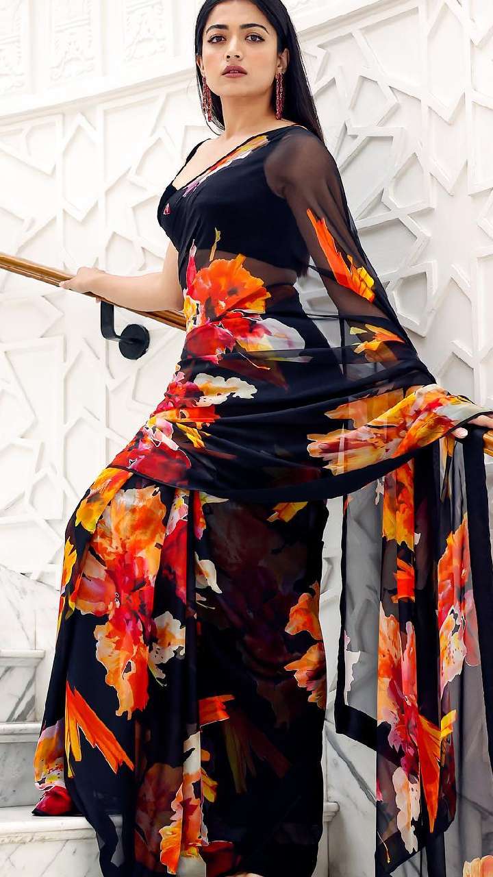 ब्लैक कलर की साड़ी में फ्लावर प्रिंट काफी ज्यादा शानदार लग रहा है। समर के लिए रश्मिका मंदाना का ये लुक शानदार है।