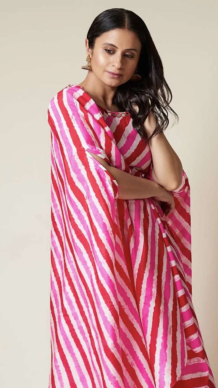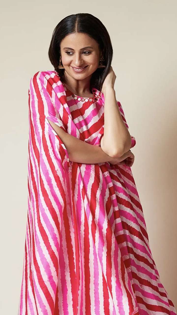 रसिका ने तस्वीर में बोट नेक लहरिया शार्ट स्लीव मैक्सी ड्रेस पहना हुआ हैं।