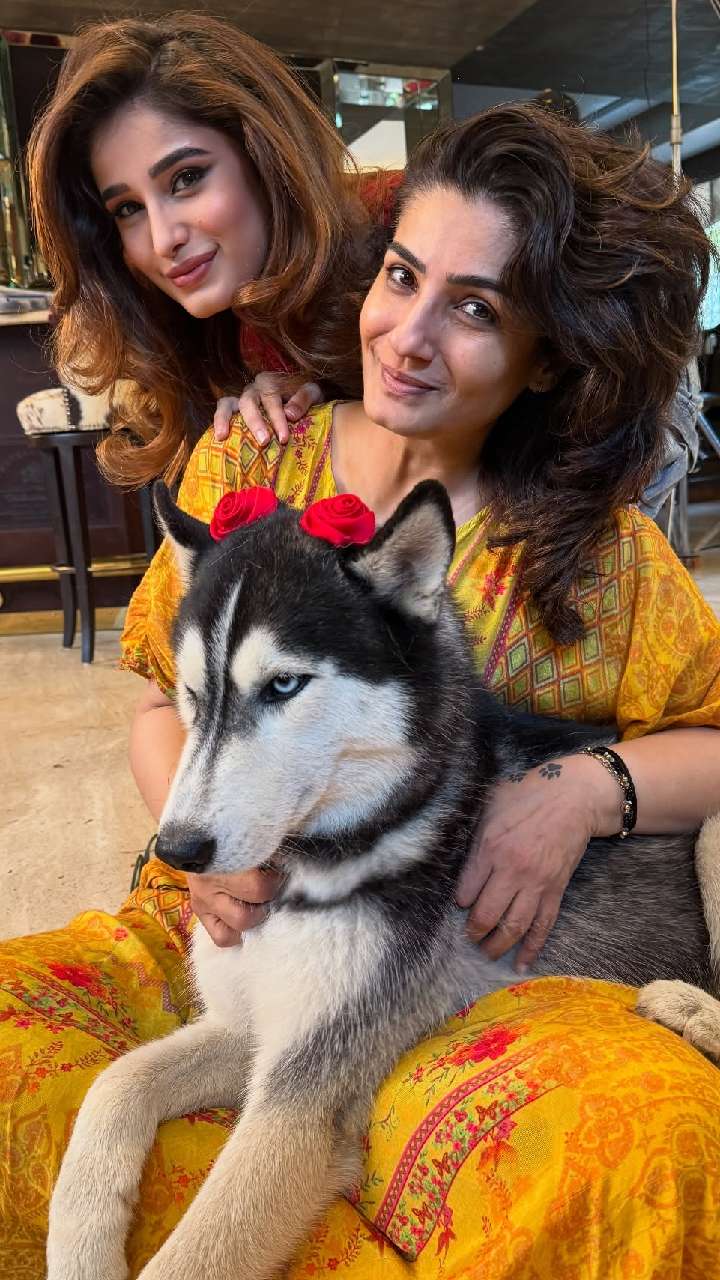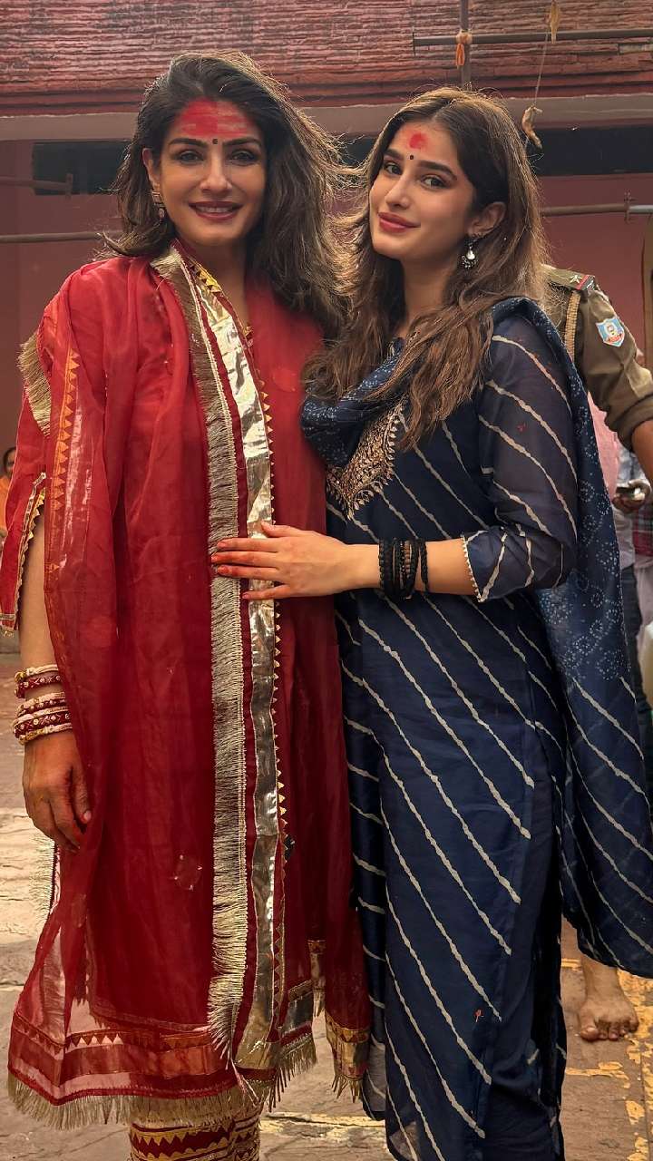 इस तस्वीर में दोनों एक्ट्रेस ने प्लाजो सूट पहना है, जिसमें दोनों काफी खूबसूरत नजर आ रही हैं। राशा ने ब्लू कलर का, तो रवीना रेड कलर के सूट में दिखाई दे रही हैं।