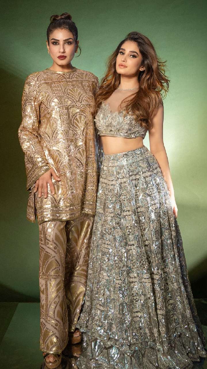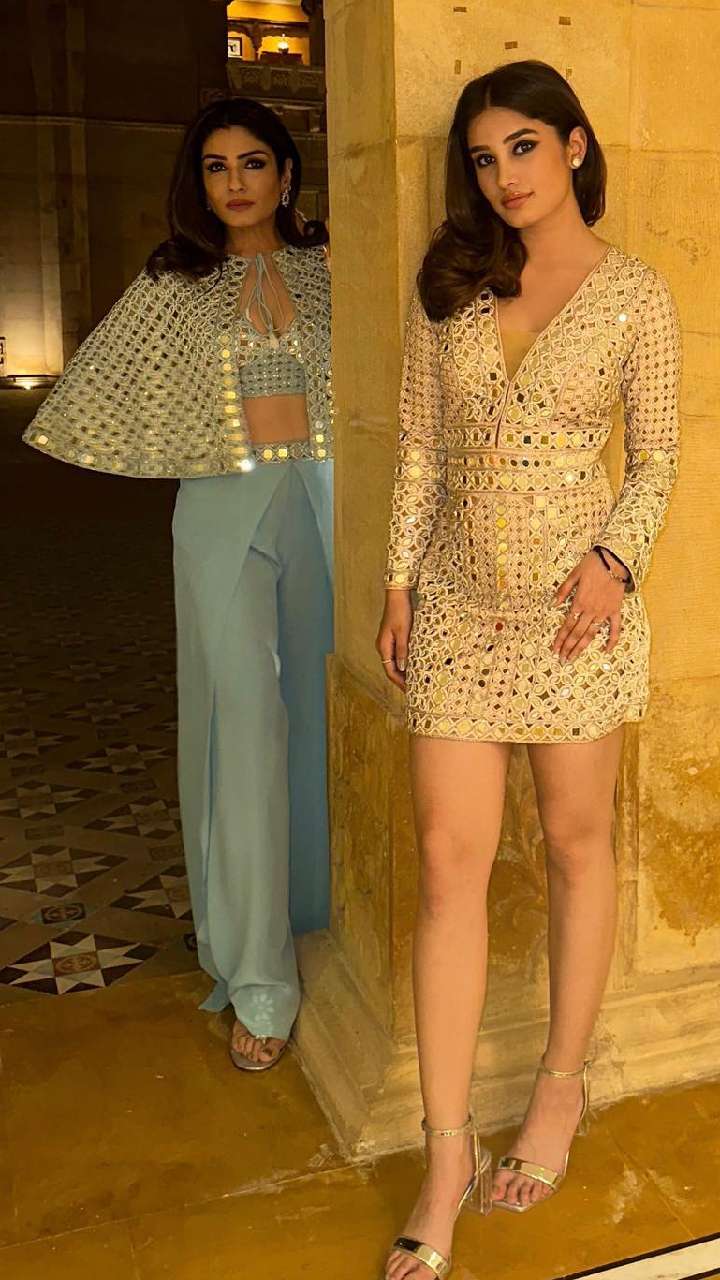 राशा और रवीना मिरर वर्क ड्रेस में बहुत प्यारे लग रहे हैं। इस तरह की ड्रेस पार्टी के लिए एकदम परफेक्ट होती हैं। आप भी उनके इस लुक को कॉपी करें।