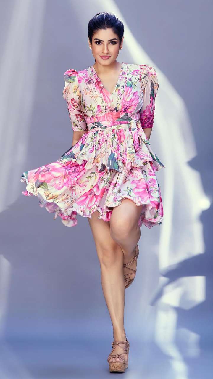 एक्ट्रेस रवीना टंडन फ्लोरल प्रिंट शॉर्ट ड्रेस में अप्सरा जैसी लग रही हैं। इस तरह की ड्रेस पार्टी के लिए बेस्ट है।