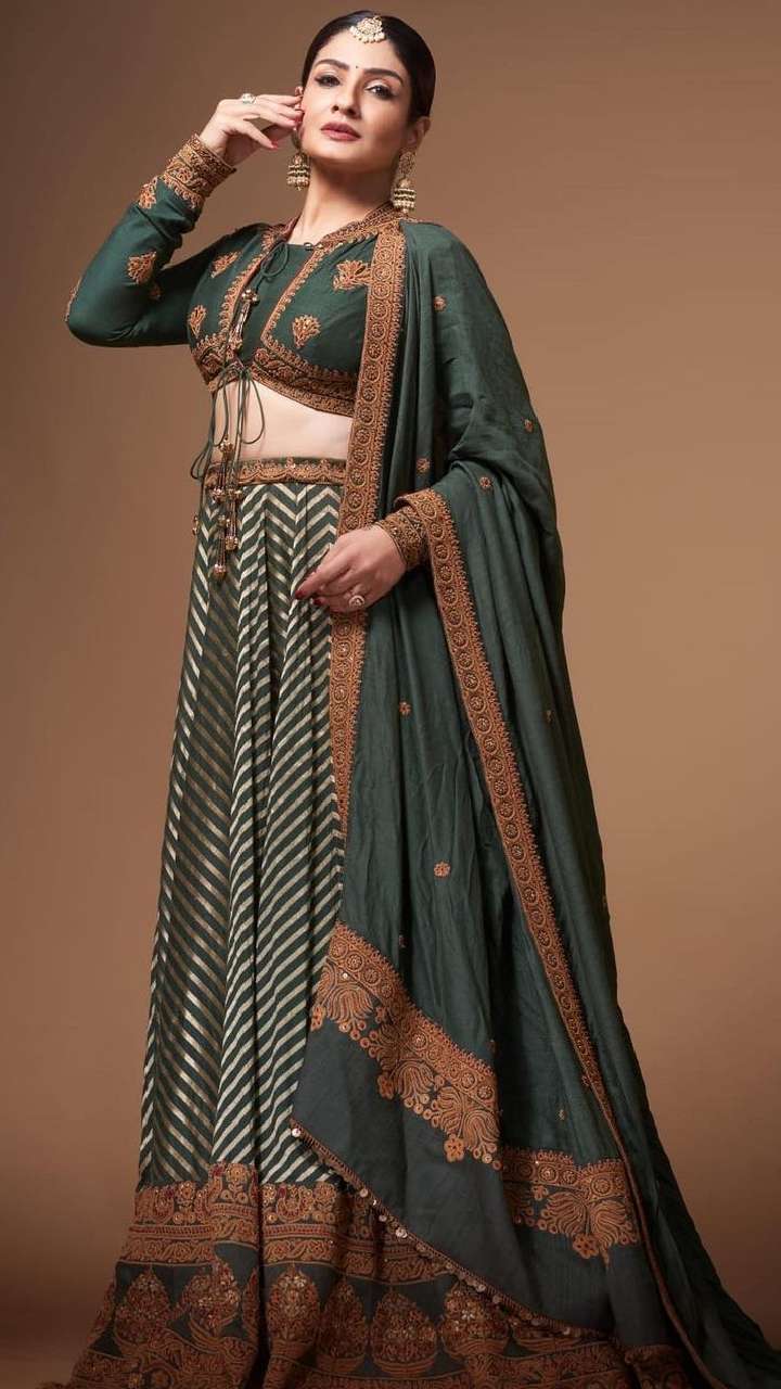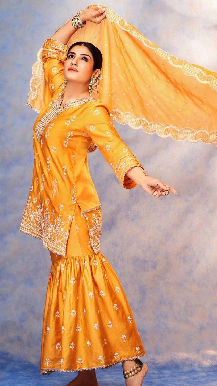 रवीना का ये सिल्क येलो कलर लहंगा लुक भी बेहद खूबसूरत लग रहा है।