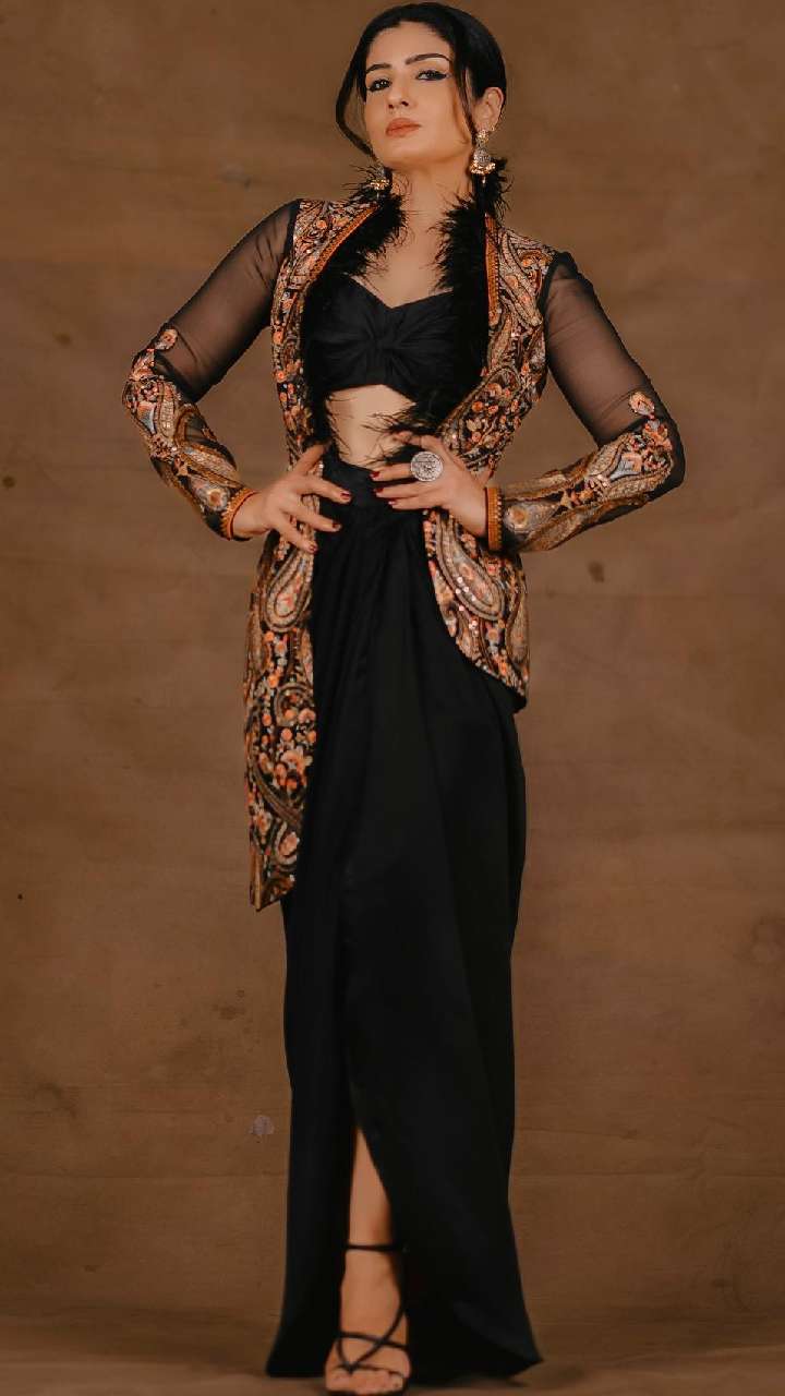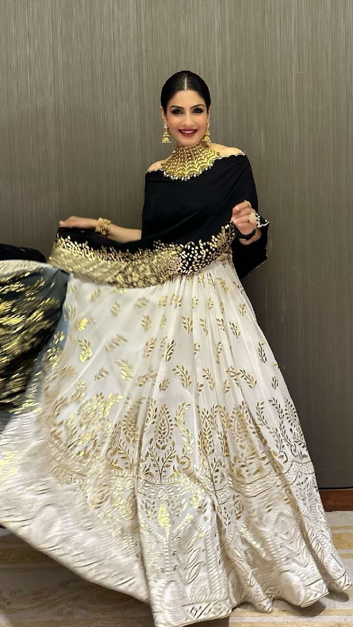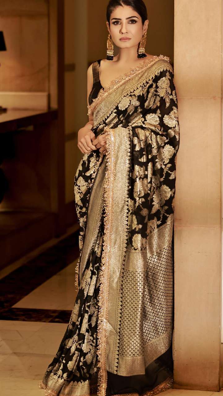 ब्लैक और गोल्डन साड़ी में रवीना टंडन का साड़ी लुक रॉयल लग रहा है। साथ ही एक्ट्रेस ने ब्लाउज भी गोल्डन पेयर किया है।