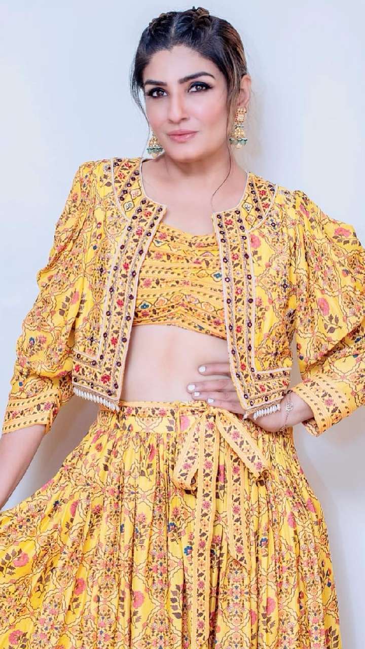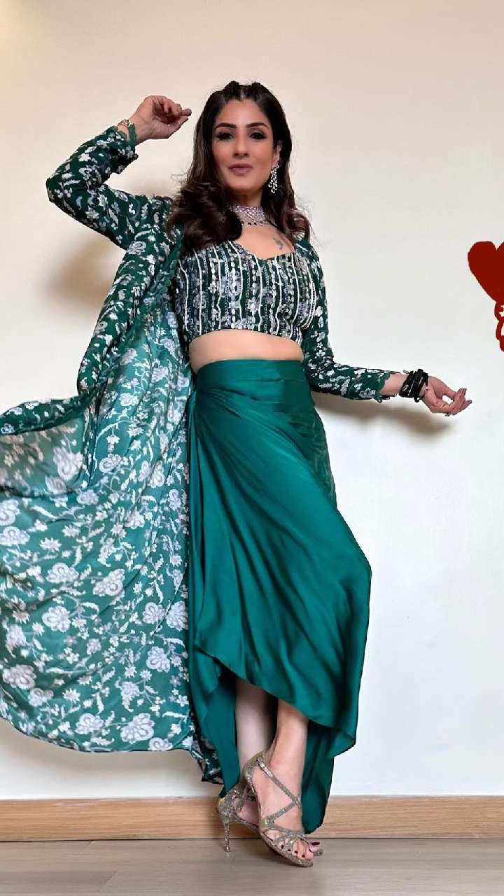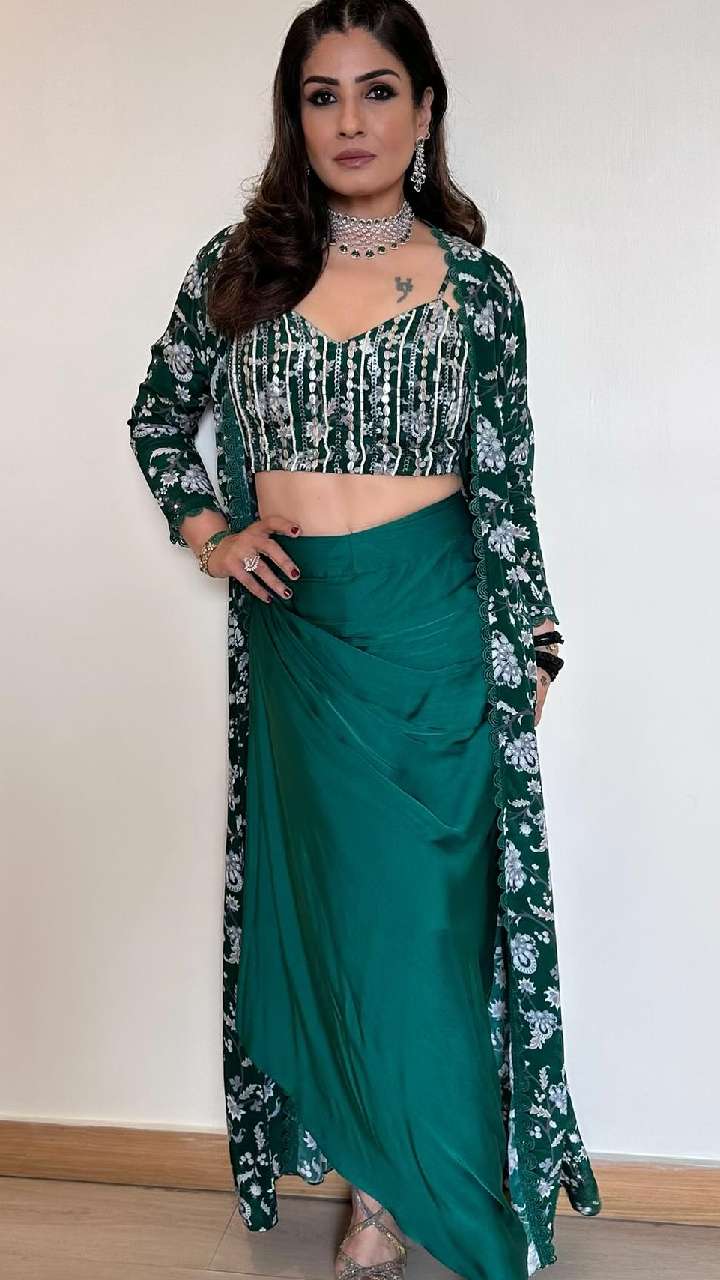 रवीना का मरून कलर की प्रिंटेड ड्रेस हैवी वर्क क्रॉप टॉप और शरारा लुक बेहद स्टाइलिश लग रहा है।