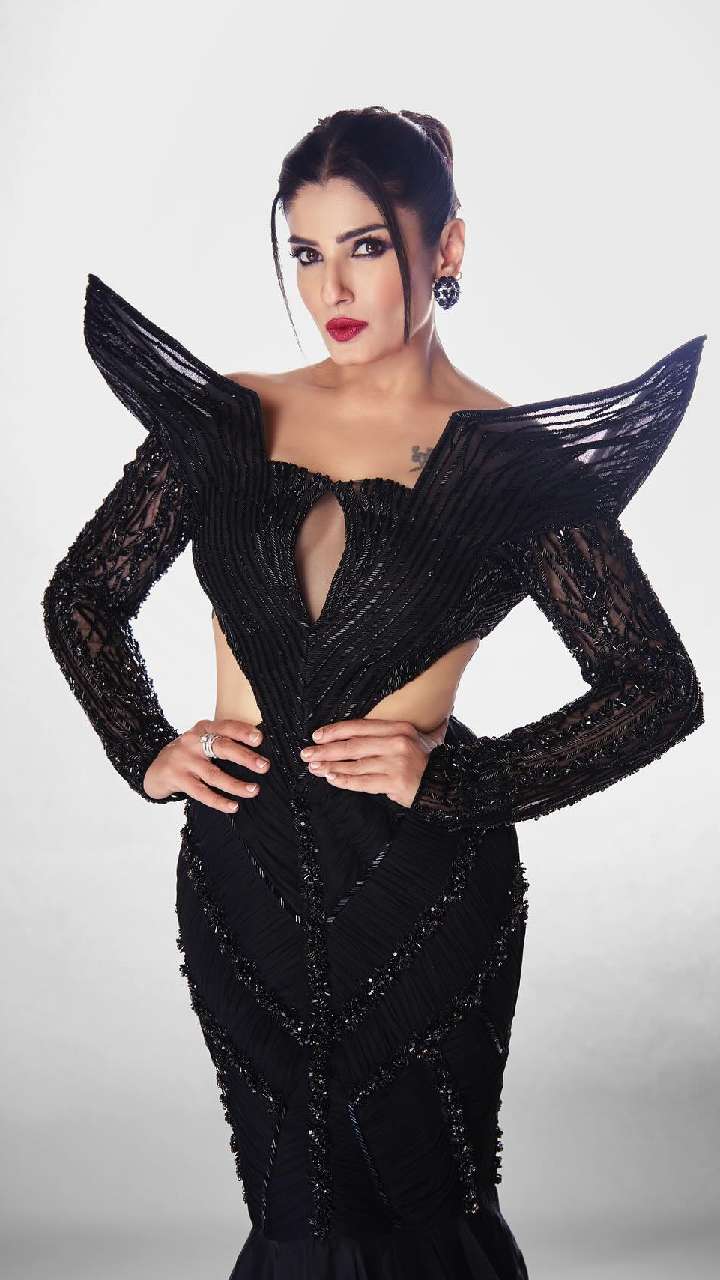 रवीना टंडन का गोल्डन वर्क इंडो-वेस्टर्न ड्रेस आपके पार्टी लुक को अट्रैक्टिव बना देगा।
