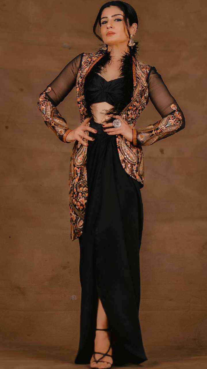 एक्ट्रेस इस ब्लैक धोती स्कर्ट क्रॉप टॉप और हेवी वर्क श्रग में काफी किलर अंदाज में नजर आ रही हैं।