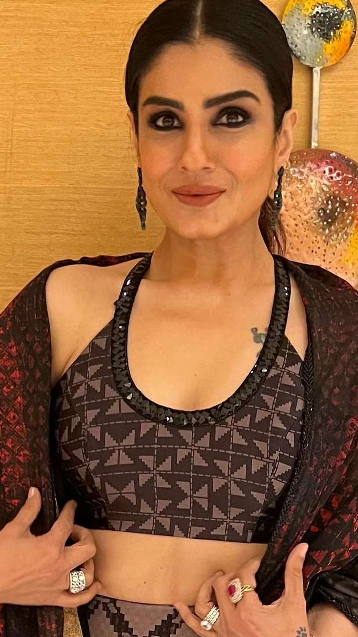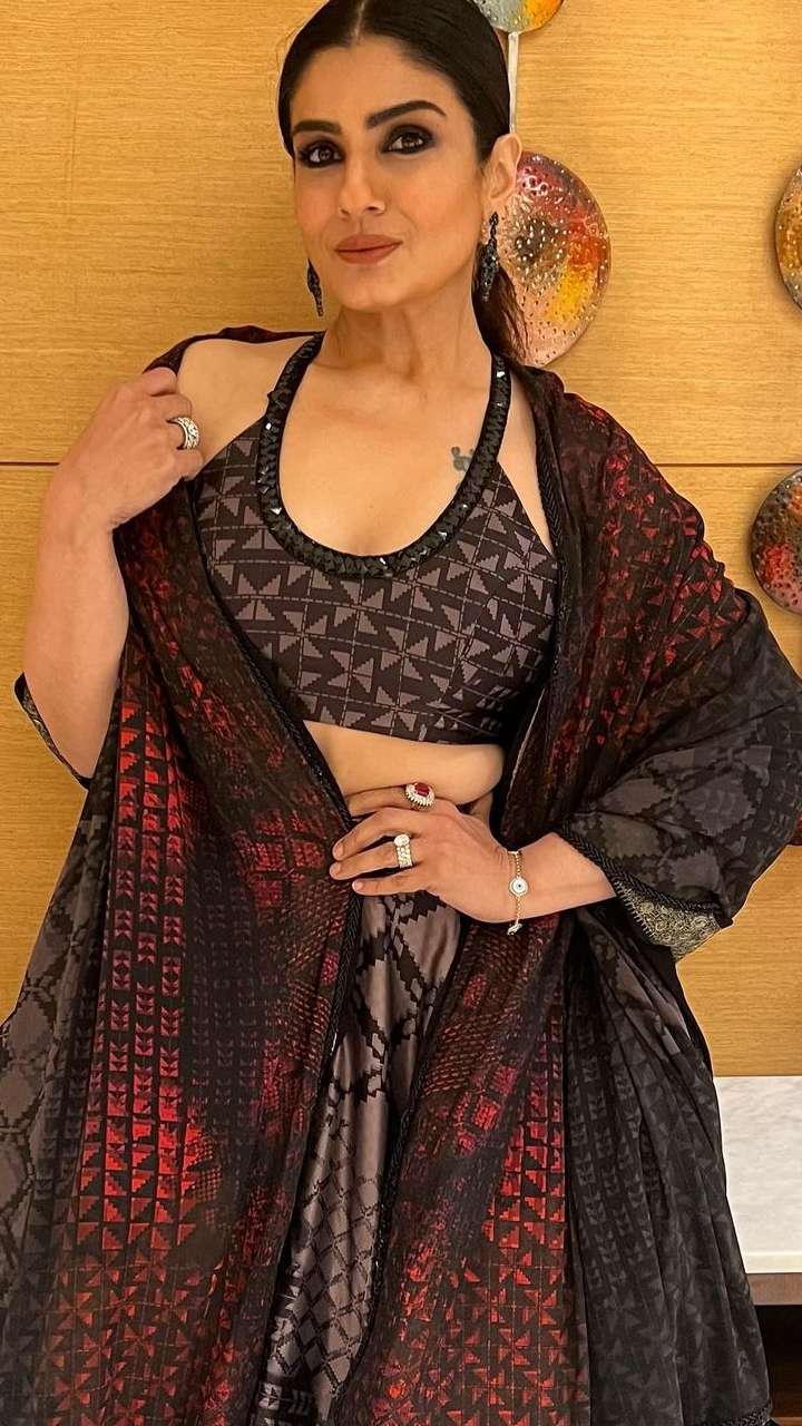 फोटो में रवीना ब्लैक आउटफिट पहने बेहद स्टनिंग पोज देती नजर आ रही हैं।