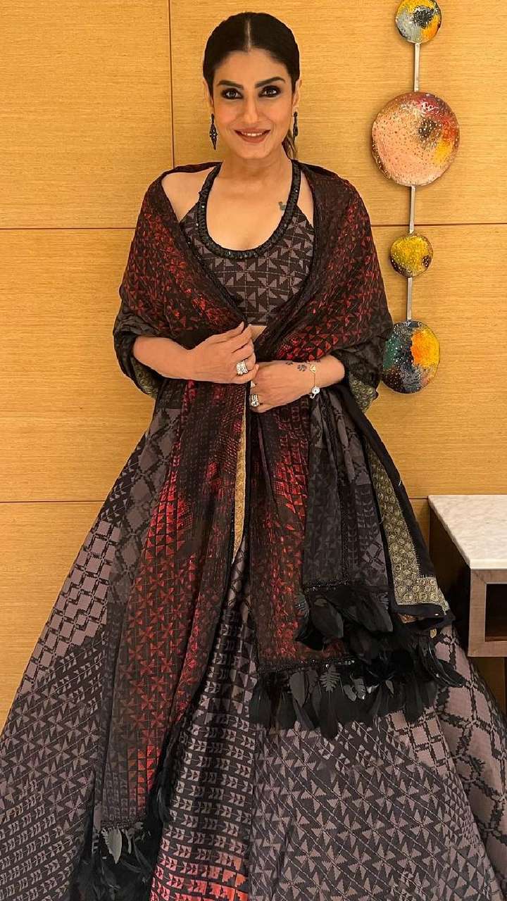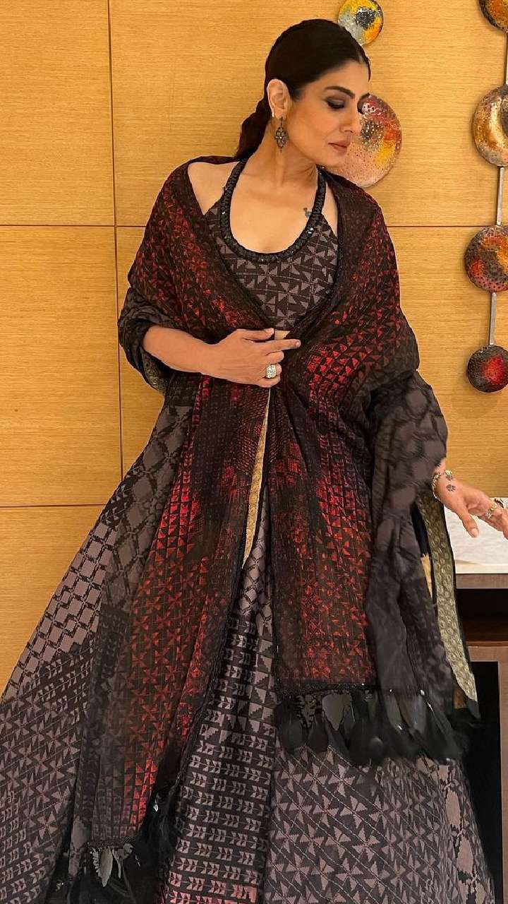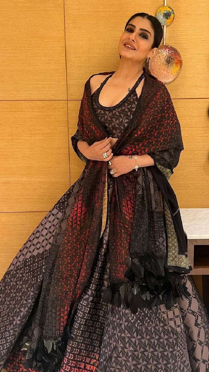 रवीना ने तस्वीर में ब्लैक कलर का प्रिंटेड डिजाइनर लहंगा, स्लीवलेस ब्लाउज और चुनरी लिए बेहद प्यारी लग रही हैं।