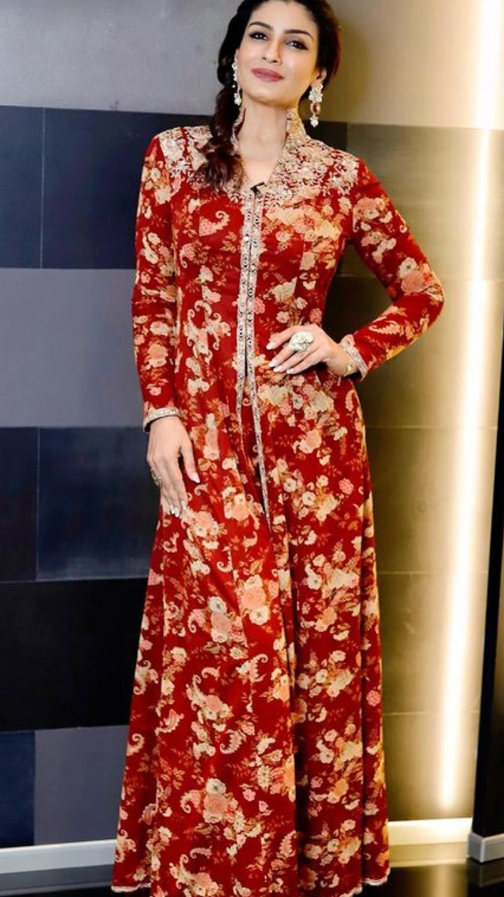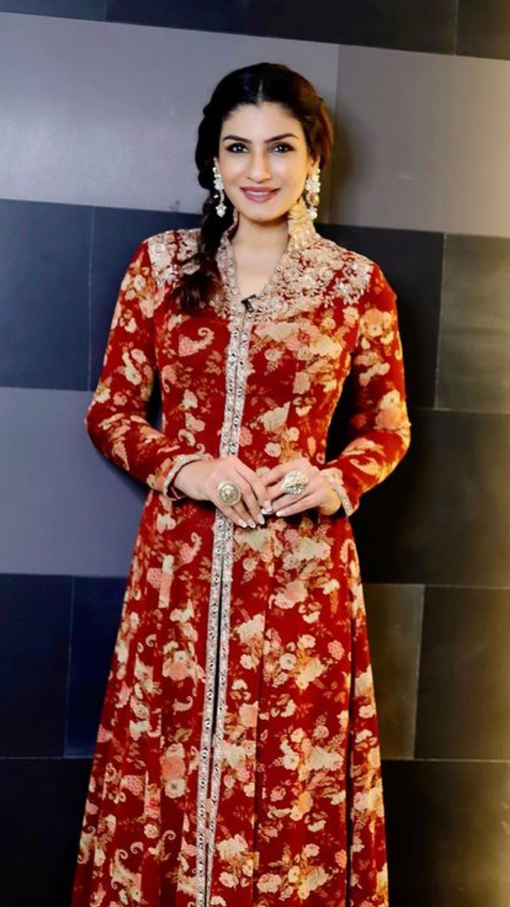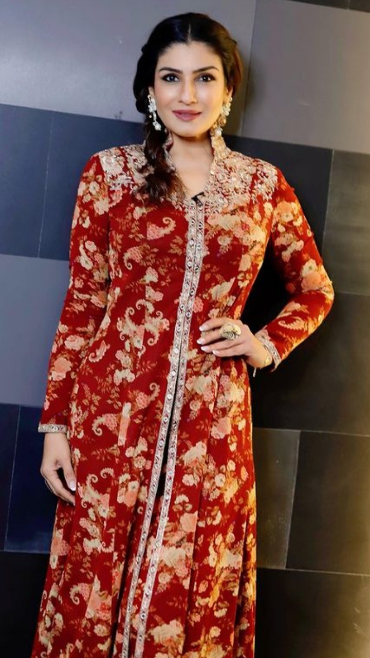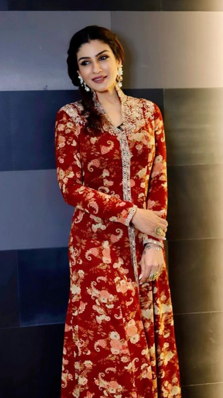 रवीना टंडन इस प्रिंटेड रेड कलर के इंडियन ऑउटफिट में बेहद गॉर्जियस लग रही हैं।