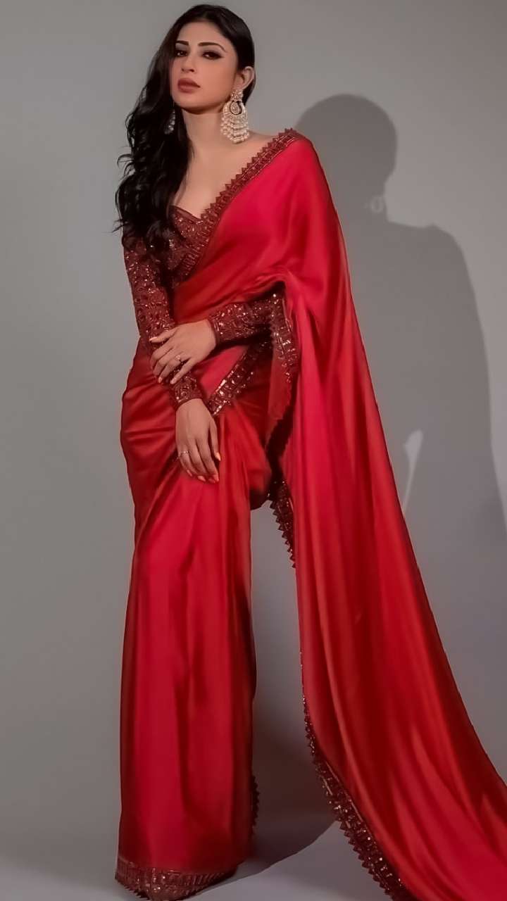 Mouni Roy सिंपल रेड साड़ी के साथ फुल स्लीव्स हैवी एंब्रॉयडरी ब्लाउज को स्टाइल किया है। पार्टी में साड़ी को ग्लैमरस लुक देने के लिए यह ब्लाउज एकदम परफेक्ट ऑप्शन है।