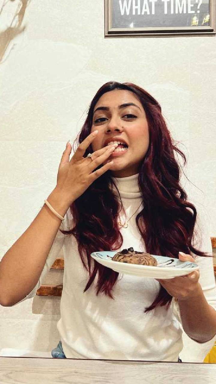 एक्ट्रेस खाने की बहुत शौकीन हैं, लेटेस्ट फोटोज में भी रीम ब्राउनी खा रहीं हैं।