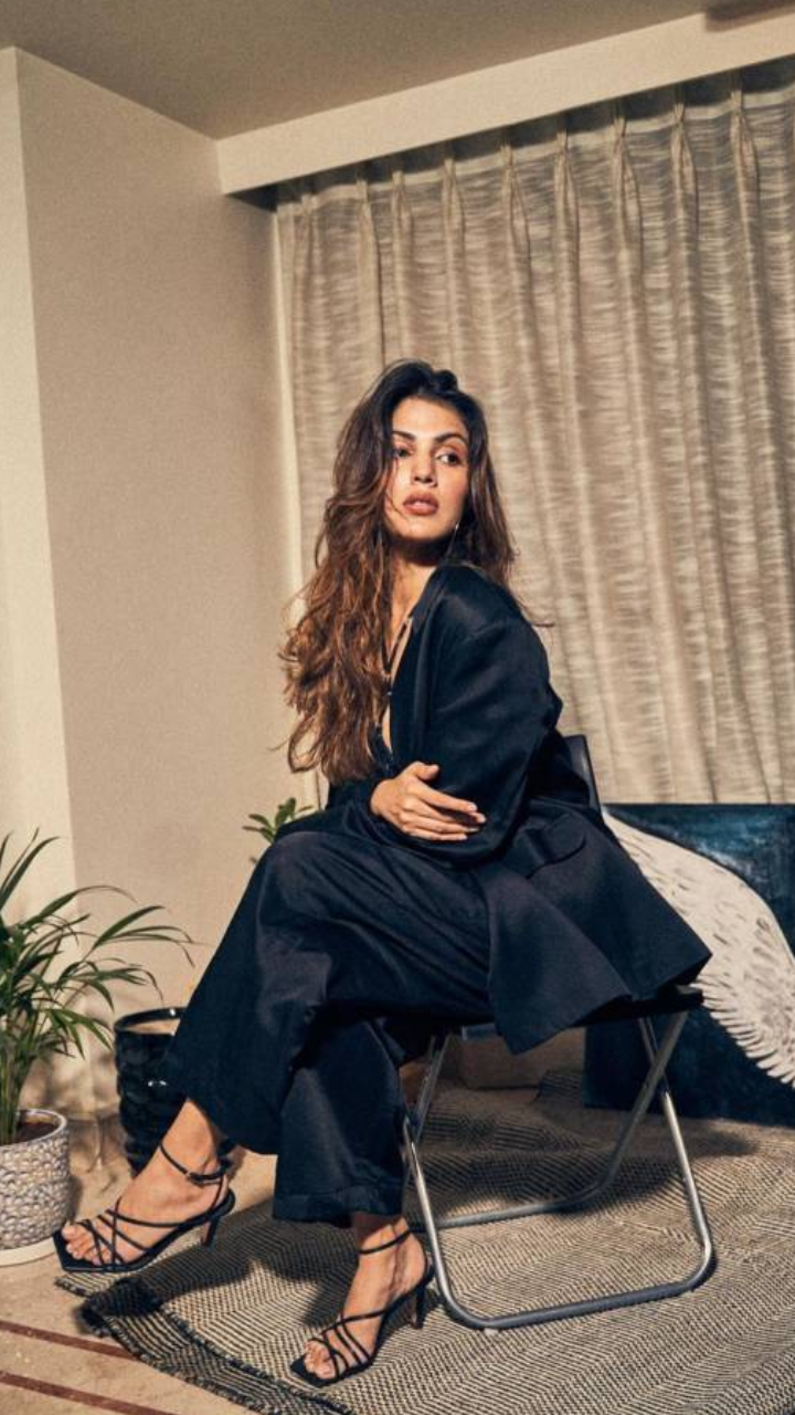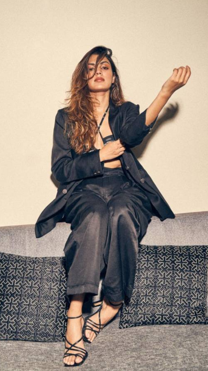 रिया ने तस्वीर में ब्लाक कलर की जैकेट पैंट और क्रॉप हेल्टर टॉप पहना रखा हैं।