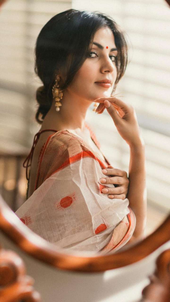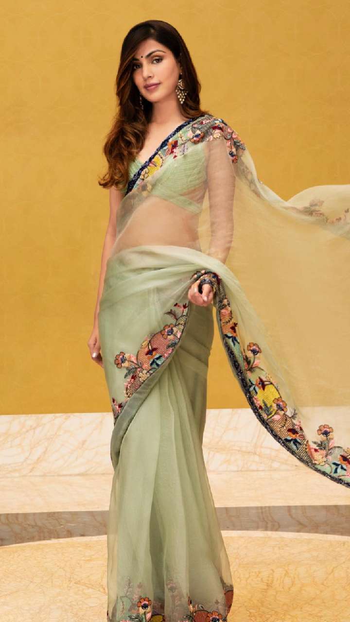 एक्ट्रेस ऑर्गेंजा फ्लोरल बॉर्डर साड़ी में काफी खूबसूरत लग रही हैं। इस तरह की साड़ी पहनकर आप अपने पति को प्यार में घायल कर सकती हैं।