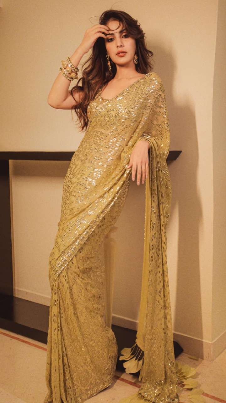 आप कॉकटेल पार्टी के लिए रिया के इस गोल्डन कलर के सीक्वेन साड़ी से आइडिया ले सकती हैं। यह साड़ी आपके लुक को ग्लैमरस बना देंगी।
