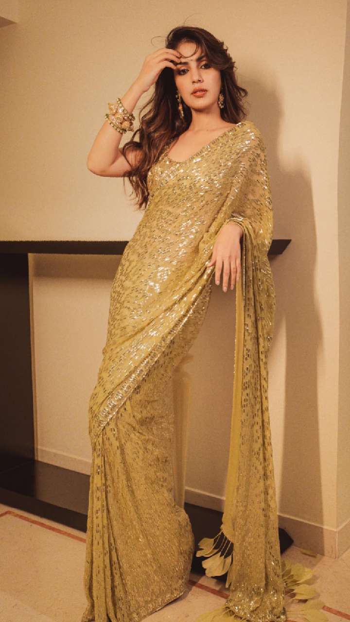 गोल्डन कलर की साड़ी में रिया चक्रवर्ती के फेस पर अलग ही ग्लो नजर आ रहा है। एक्ट्रेस की ये साड़ी कॉकटेल पार्टी के लिए बेस्ट है।