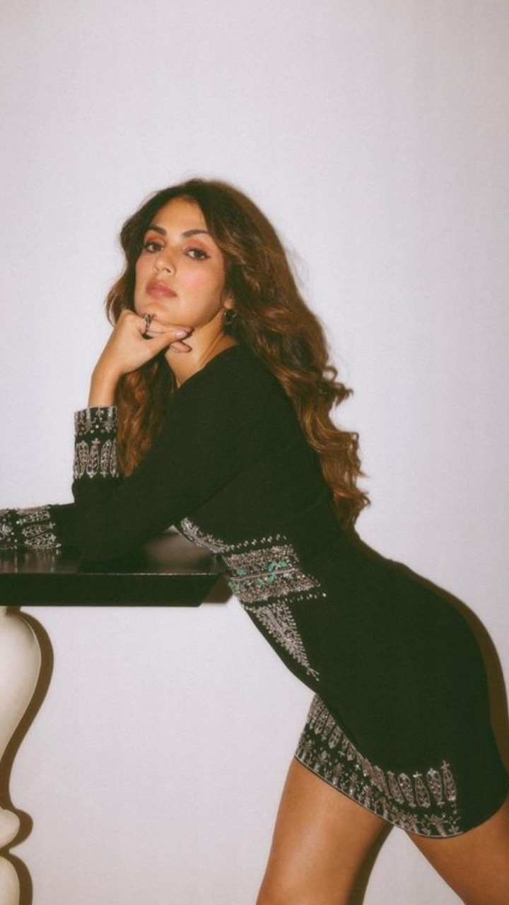 रिया ने तस्वीर में ब्लैक कलर की वन पीस डीप नेक ड्रेस पहनी और हील सैंडल पहनी हुई है।