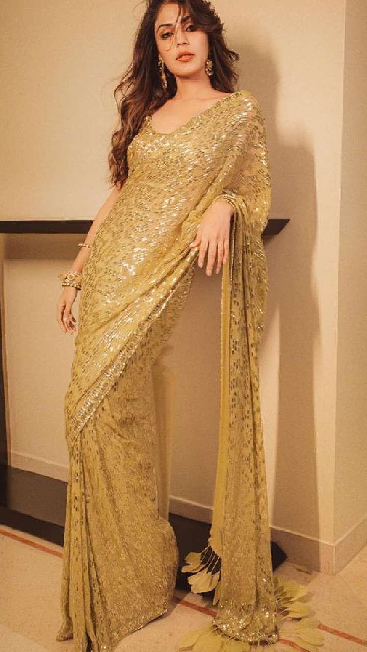 रिया चक्रबोर्ती इस साड़ी लुक में भी बेहद खूबसूरत लग रही है।