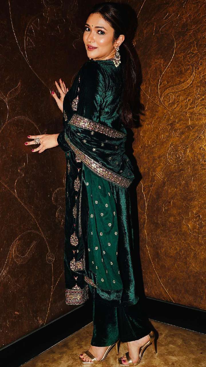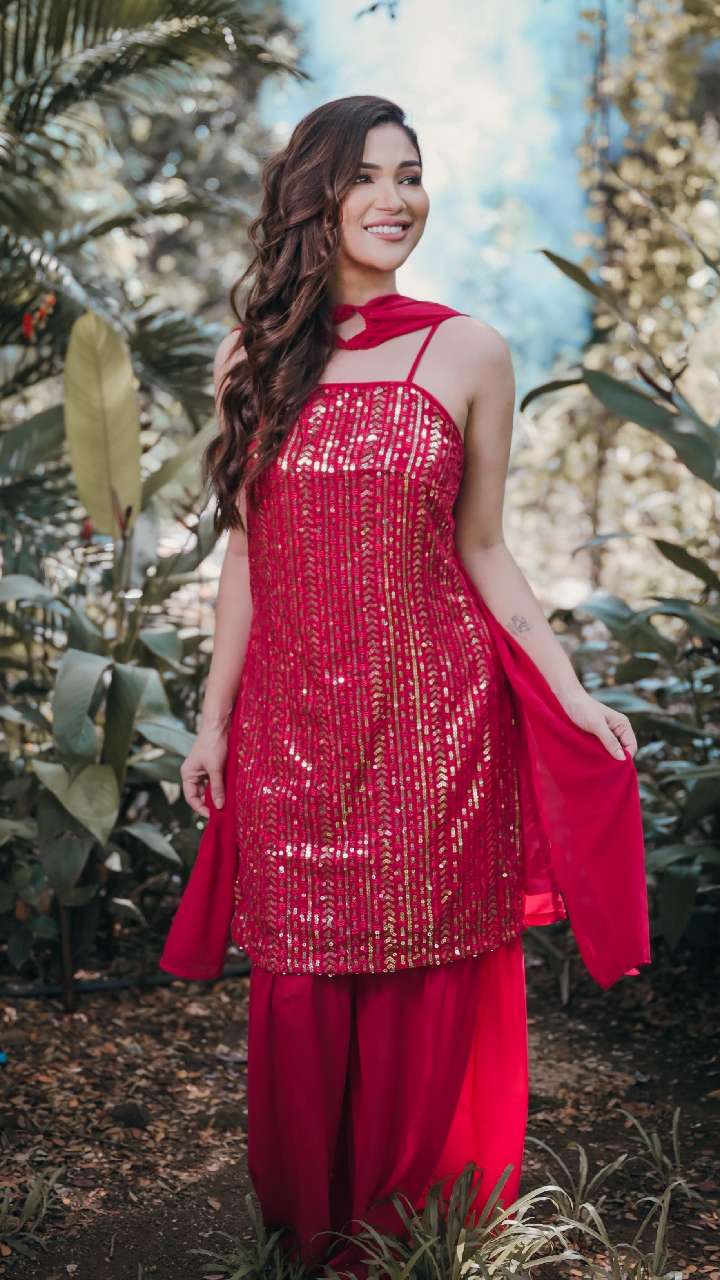 इस पिंक कलर के शिमरी नूडल स्ट्रैप प्लाजो सूट में अभिनेत्री बला की खूबसूरत लग रही हैं।