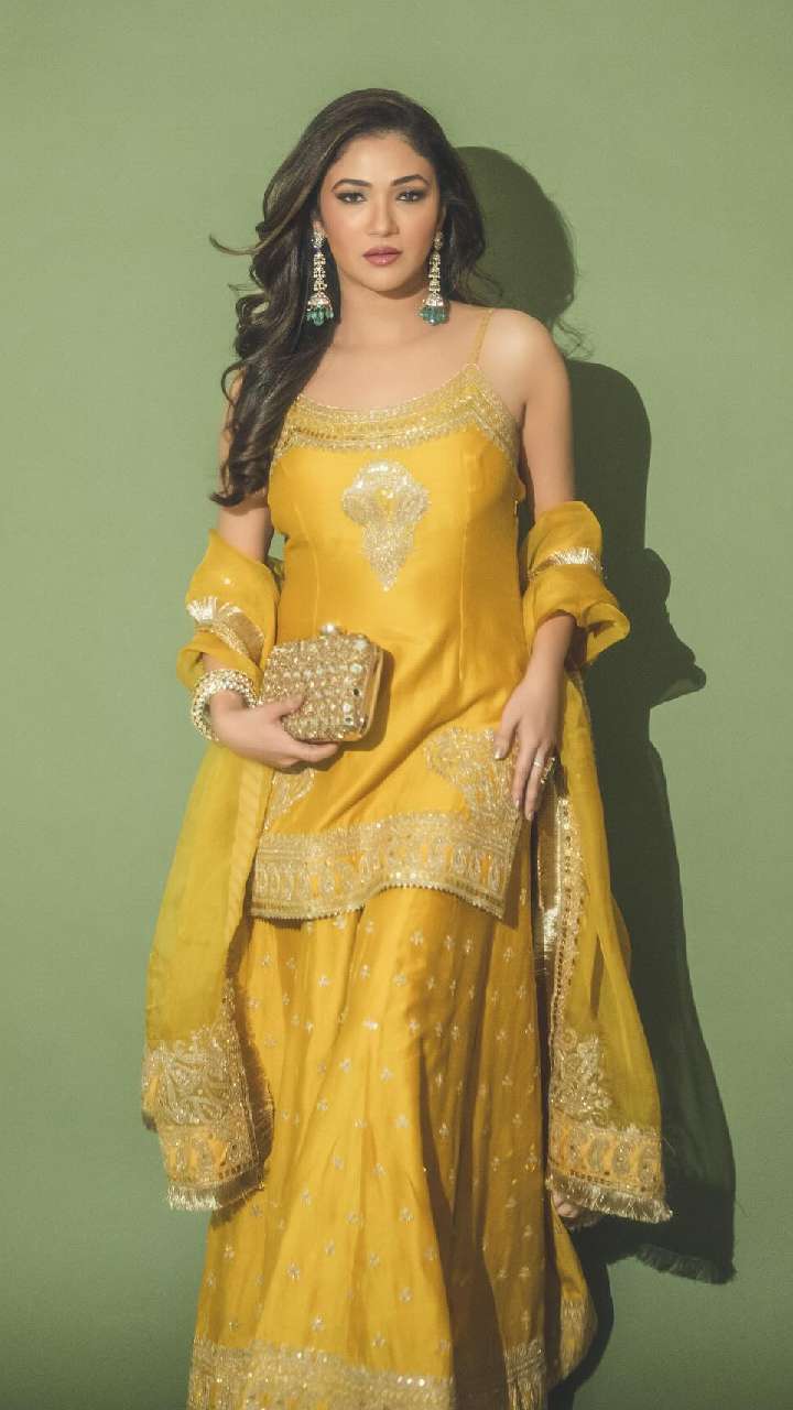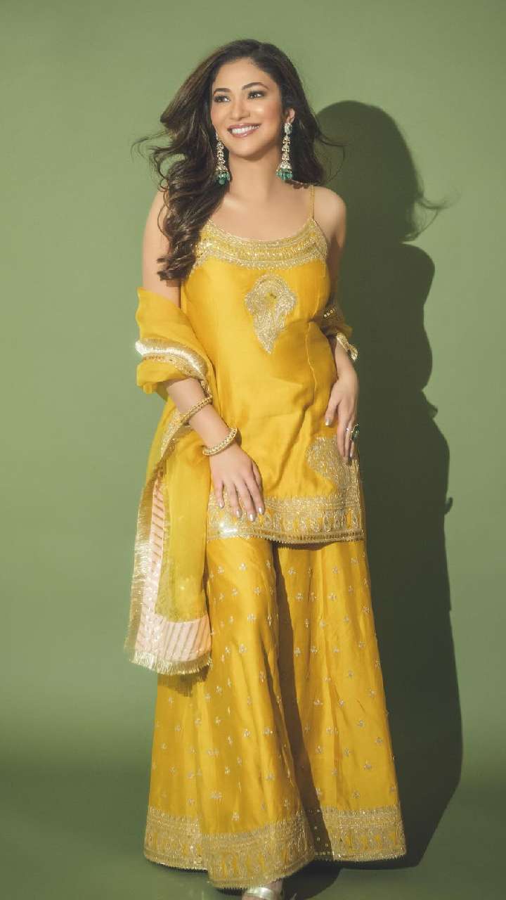रिद्धिमा इस येलो कलर के जरी वर्क सिल्क शरारा सूट में खूबसूरती की अजब मिसाल पेश कर रही हैं। आप उनके इस लुक को किसी भी वेडिंग फंक्शन में कैरी कर सकती हैं।