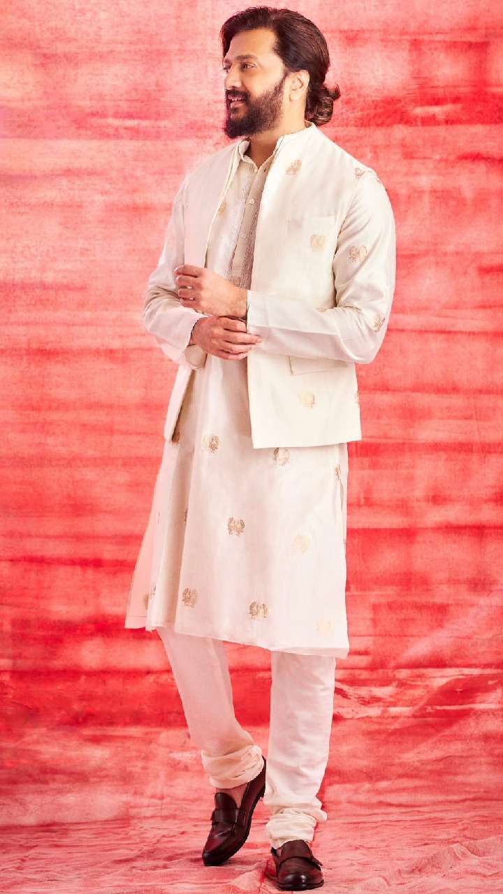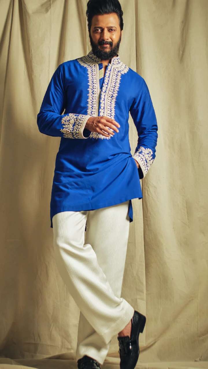 रितेश देशमुख ने ब्लू कलर के कुर्ते के साथ व्हाइट पजामा पहना है, जो हर फंक्शन के लिए बेस्ट है। आप भी एक्टर के इस लुक से आइडिया ले सकते हैं।