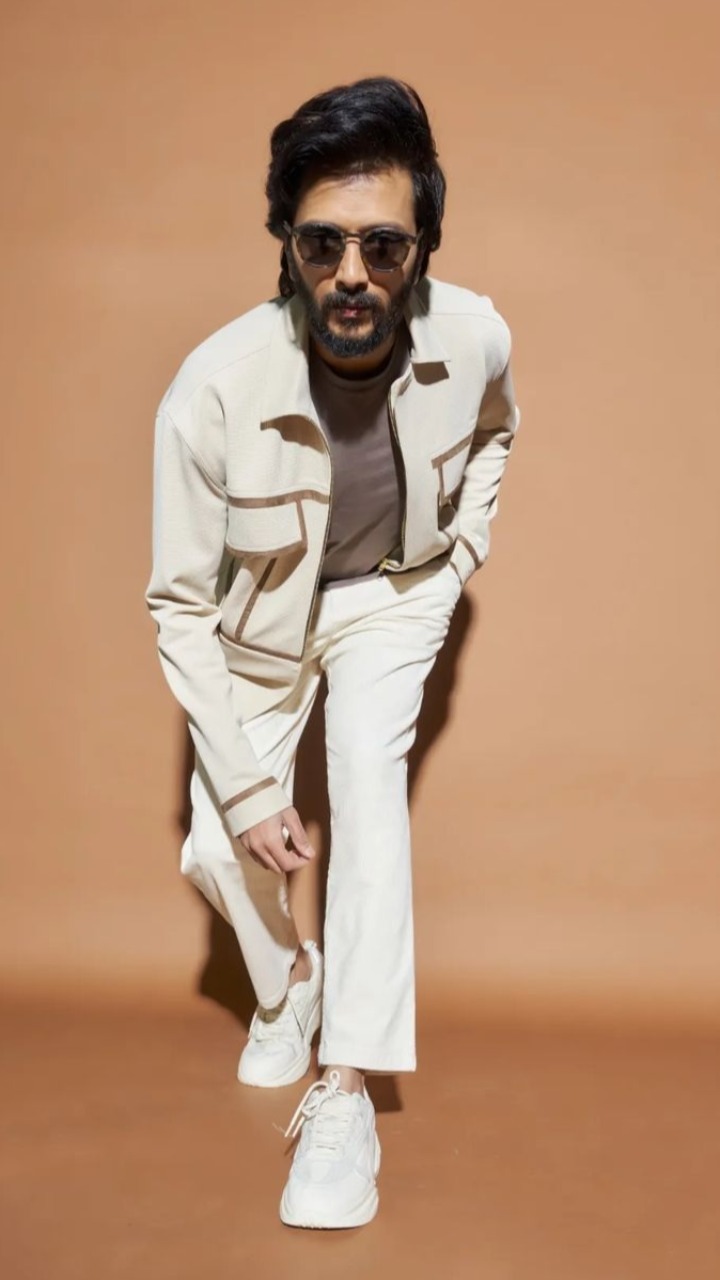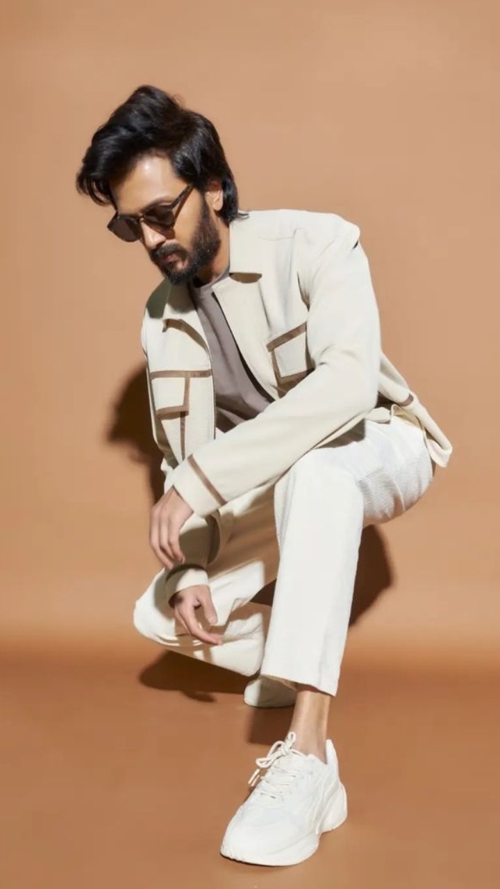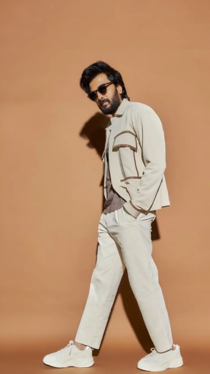 एक्टर ने क्रीम कलर की जैकेट और पैंट के साथ डार्क टी-शर्ट पहनी हैं। साथ ही व्हाइट कलर के शूज कैरी किये हैं।