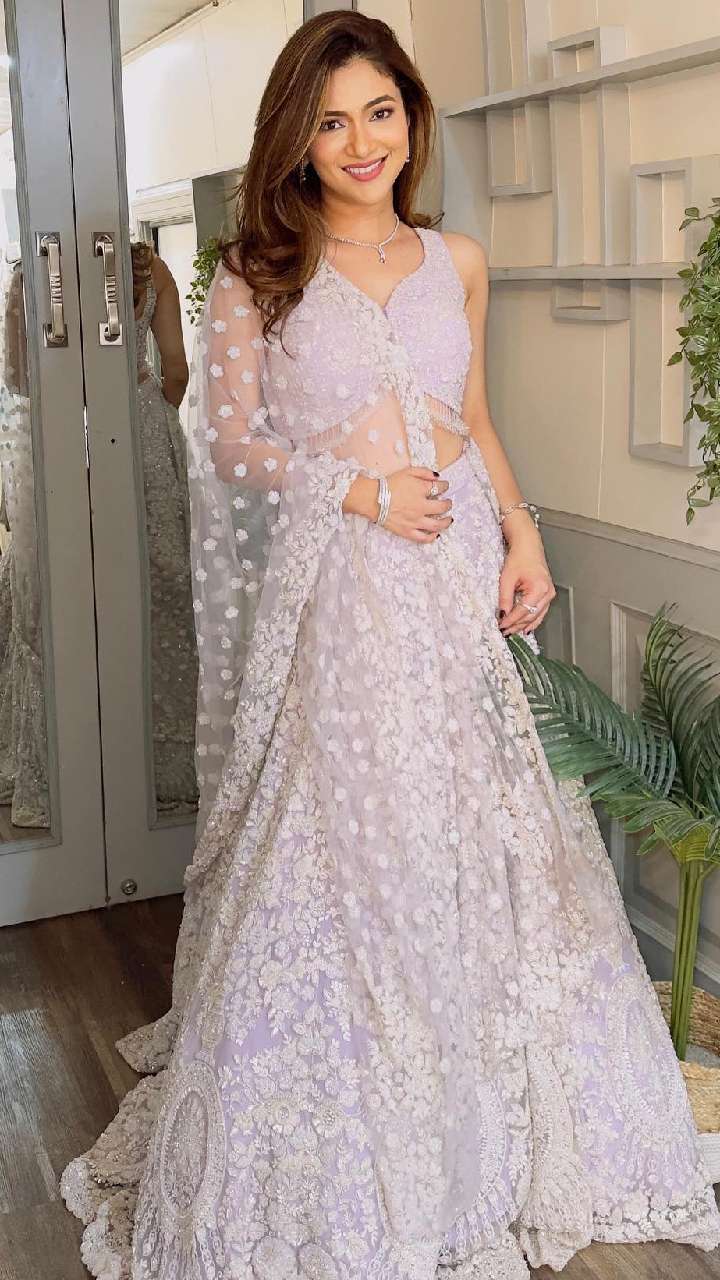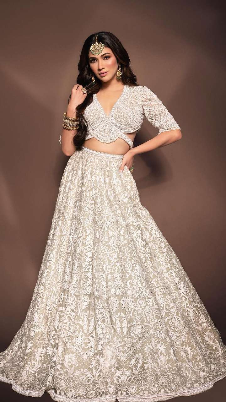 यंग गर्ल्स एक्ट्रेस के इस क्रीम कलर नेटिड विद गोल्डन सितारों वर्क लहंगे को ट्राई कर सकती हैं। इसके साथ स्ट्रैपी चोली आपके लुक में जान डाल देगी।
