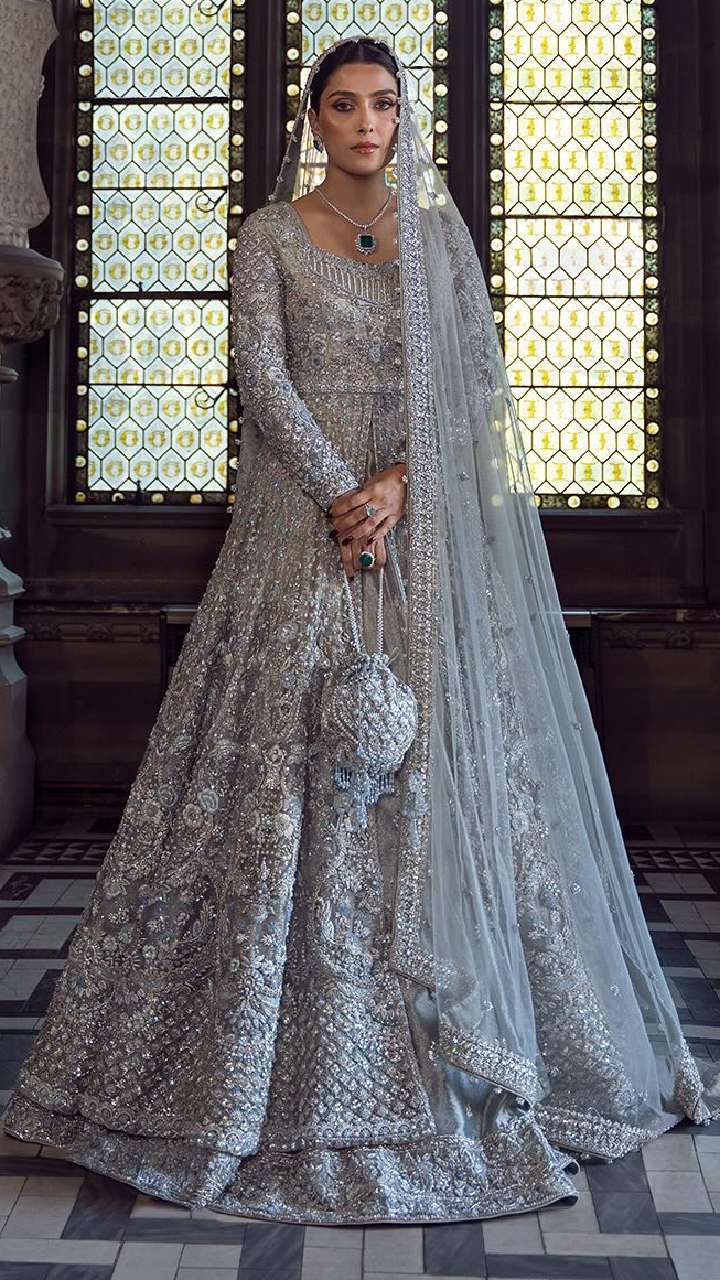 सिल्वर कलर के इस हैवी लॉन्ग अनारकली सूट में Ayeza Khan बेहद ग्लैमरस लग रही है। साथ ही, एक्ट्रेस का पेंडेंट स्टाइल नेकलेस लुक में चार-चांद लगा रहा है। शादी के बाद पहले फंक्शन के लिए यह आउटफिट बेस्ट है।