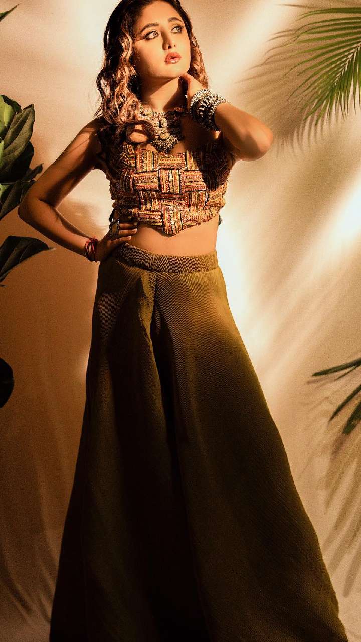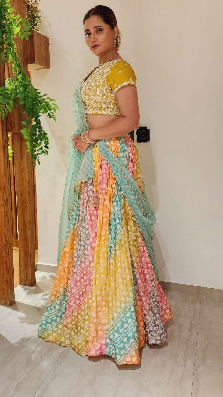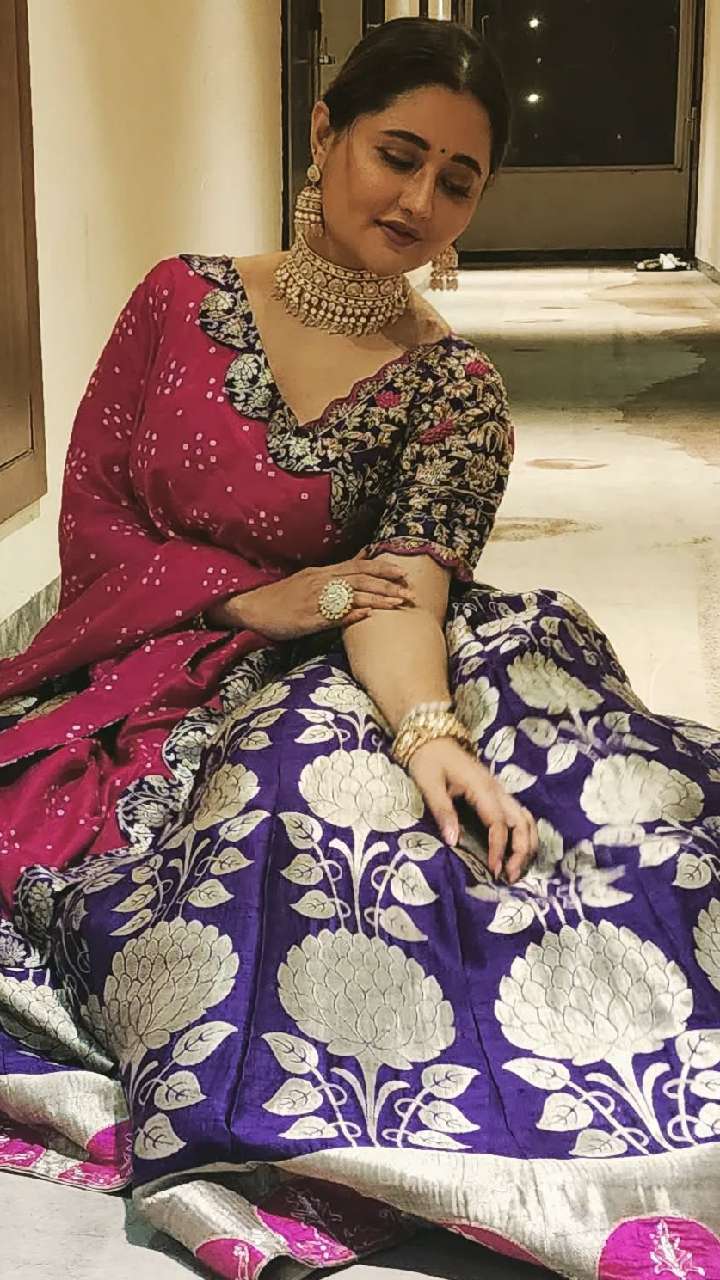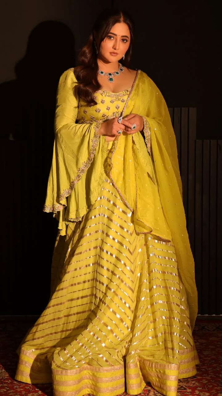 इस फ्लोर लहंगे में Rashami खूबसूरत लग रही हैं। ऐसे सिंपल डिजाइनर लहंगे आजकल ट्रेंड में है। कर्ली हेयर स्टाइल के साथ आप इस लुक को एलिगेंट बना सकती हैं। एक्ट्रेस के इन स्टाइलिश लहंगे को पहनकर आप महफिल में रानी जैसा लुक पा सकती हैं।