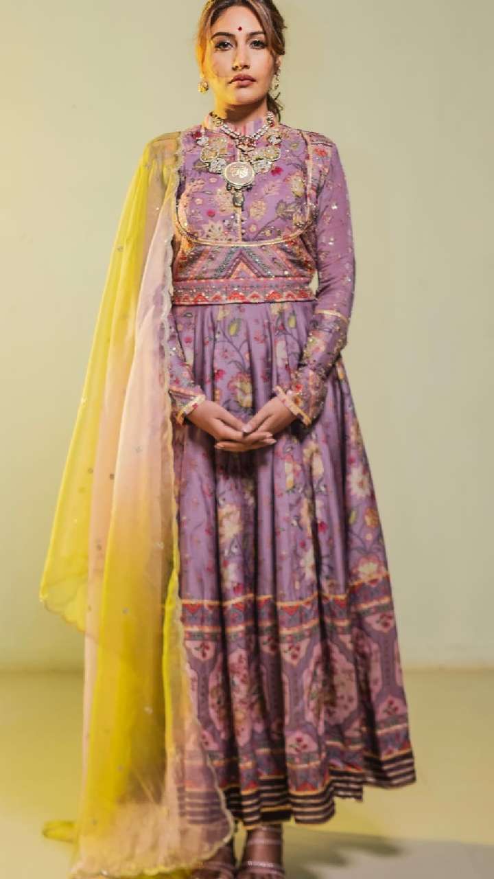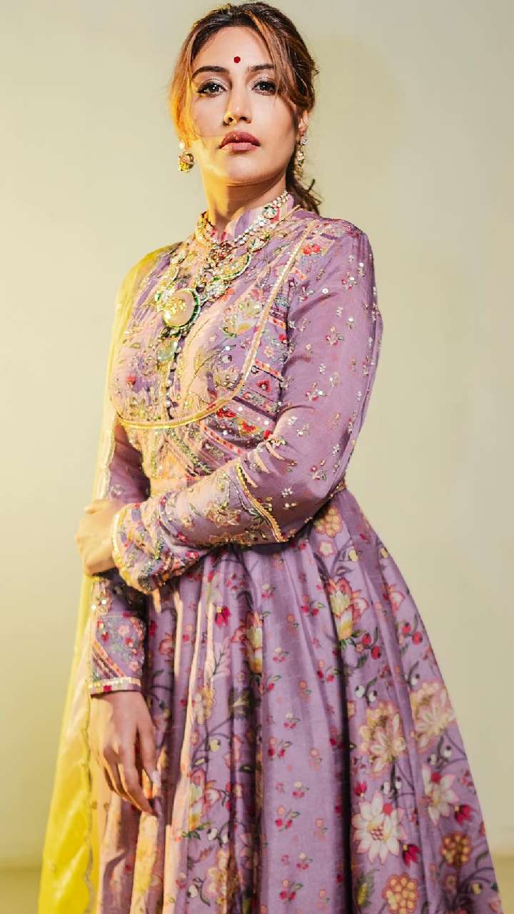 सुरभि इस पर्पल कलर के फ्लोरल प्रिंट वाले अनारकली सूट में बेहद खूबसूरत लग रही हैं। एक्ट्रेस की हाई पोनी लुक को आप भी कॉपी कर सकती हैं।