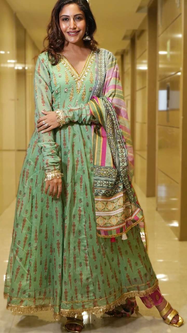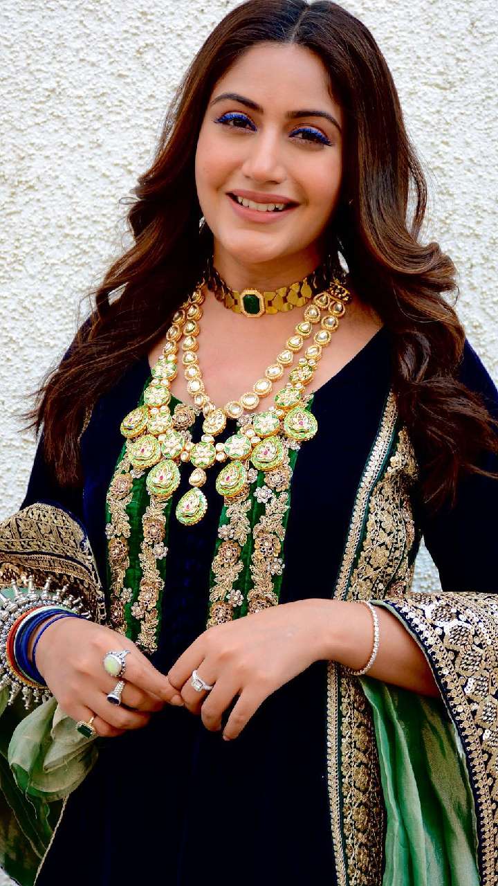 एक्ट्रेस का ग्रीन और ब्लू कलर का वेलवेट सूट काफी रॉयल लुक दे रहा है। उनका नेकलेस इस सूट की शोभा में चार-चांद लगा रहा है। आप एक्ट्रेस के सूट को लूज बन के साथ स्टाइल कर सकती हैं।