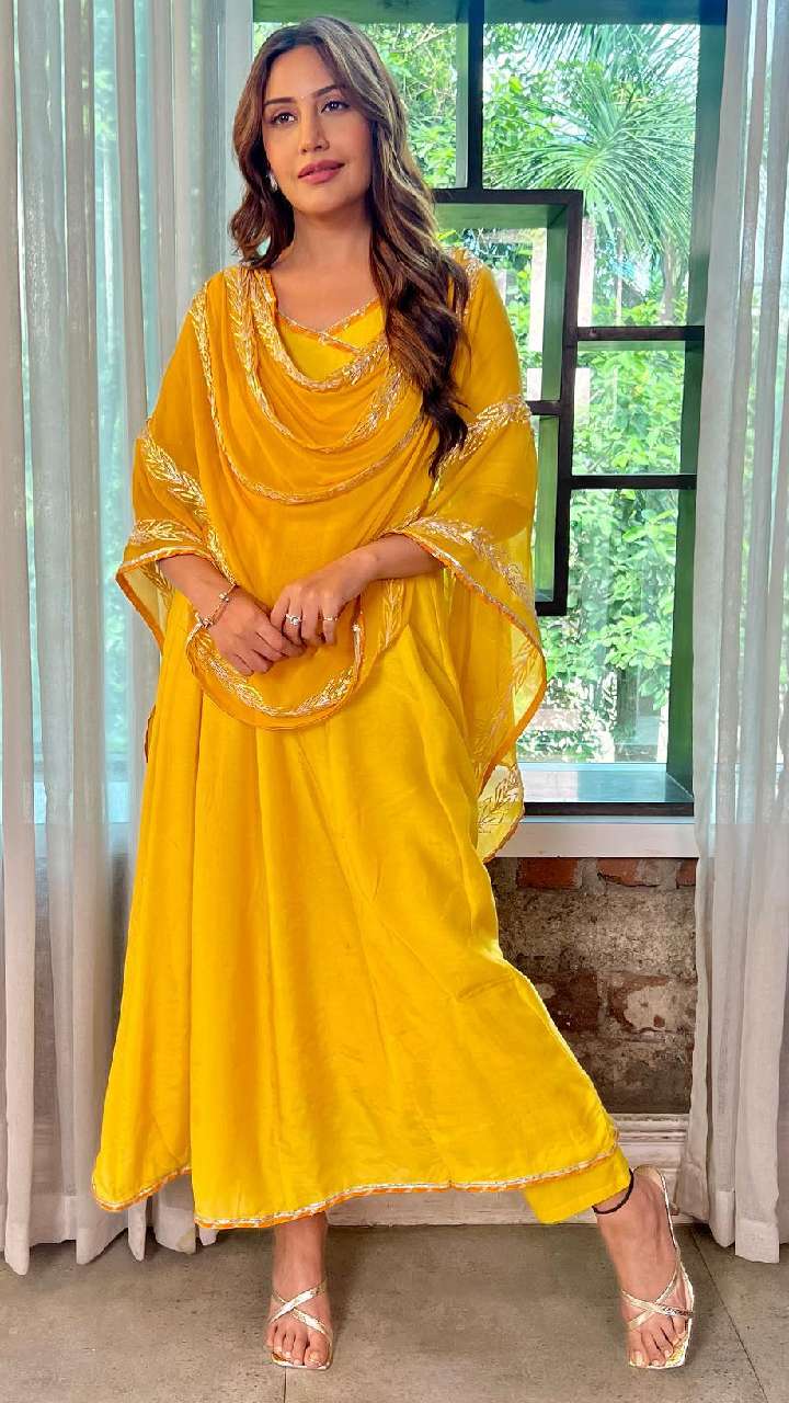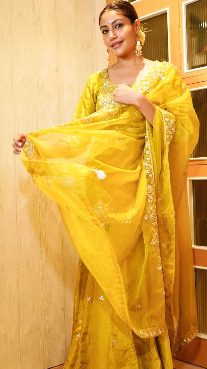 पति को अपने लुक्स से लुभाना चाहती हैं, तो एक्ट्रेस का यह येलो कलर का फ्लोरल सूट जरूर ट्राई करें। यह देखने में ही काफी रॉयल लुक है। आप इस सूट को किसी फंक्शन में भी कैरी कर सकती हैं।