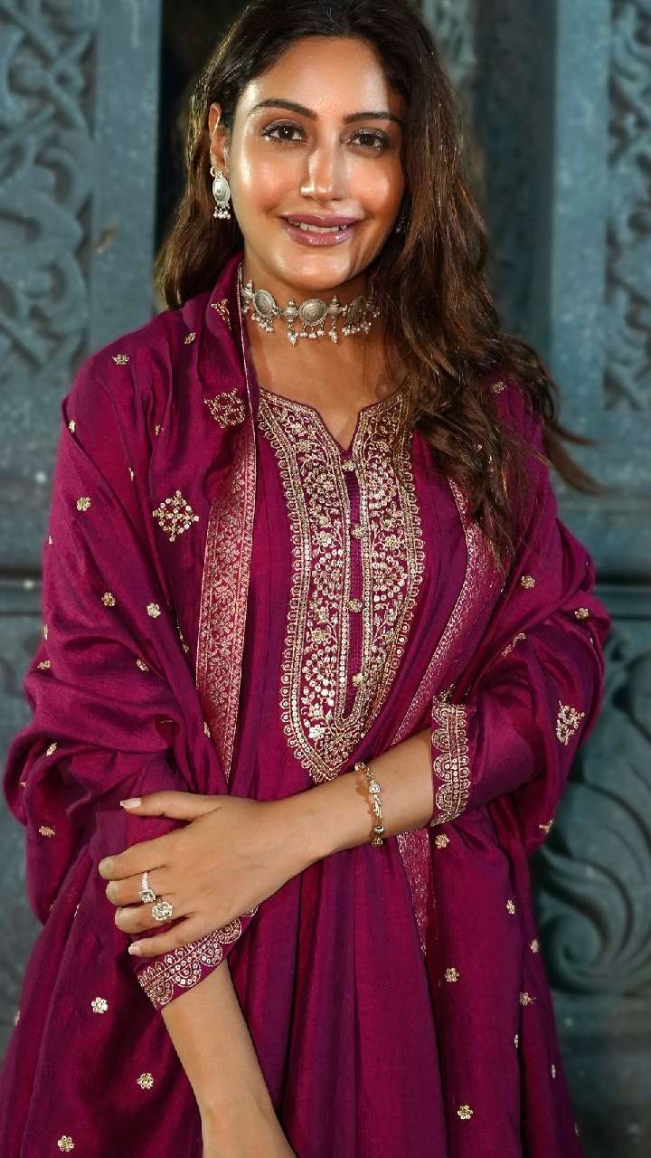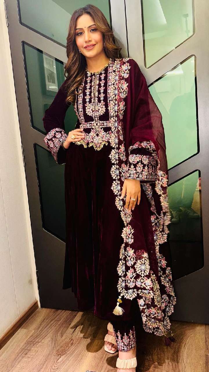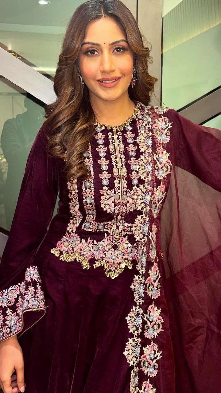 मैरून वेलवेट सूट एक्ट्रेस की खूबसूरती को बढ़ा रहा है। आप इस सूट के दुपट्टे को अच्छे से स्टाइल करके अपने पिया को लुभा सकती हैं।