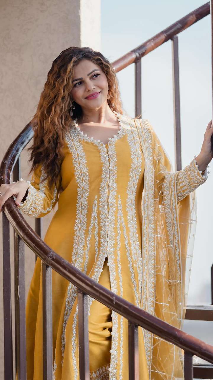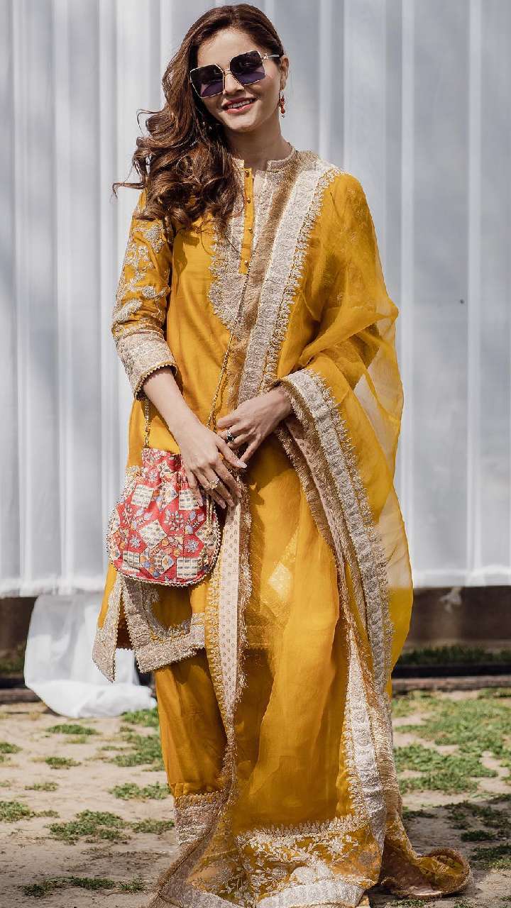 तीज पर हर किसी की तारीफ पाने के लिए आप अभिनेत्री के जैसा मस्टर्ड येलो प्लाजो सूट पहन सकती हैं। इसमें जरी एम्ब्रॉडयरी वर्क किया गया है।
