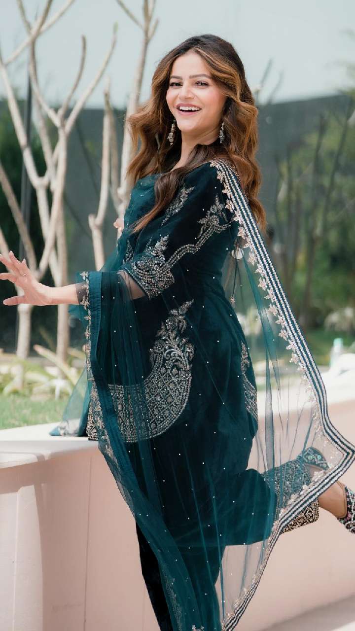 आप रुबीना के जैसा डार्क ग्रीन सिल्वर वर्क वाला सलवार-सूट भी ट्राई कर सकती हैं। ये आपके तीज लुक में चार चांद लगा देगा।
