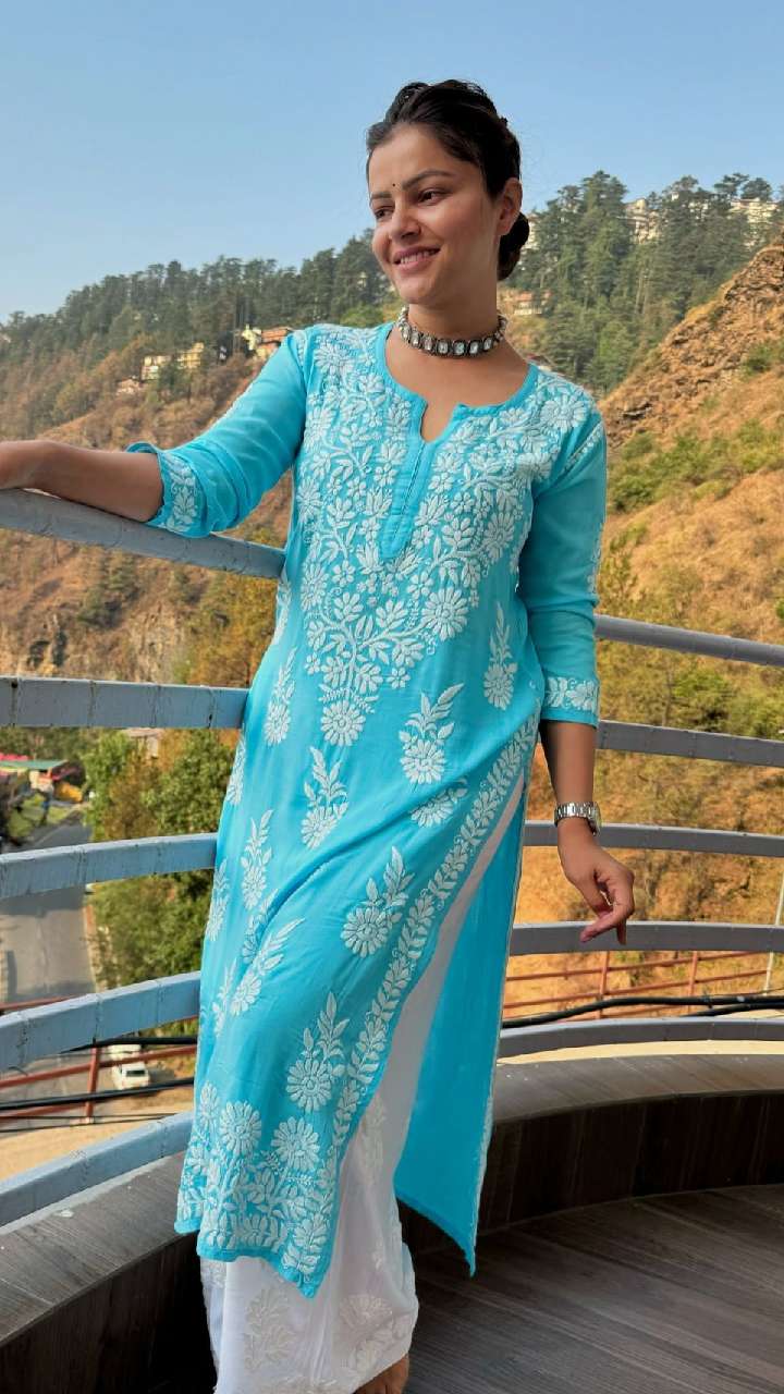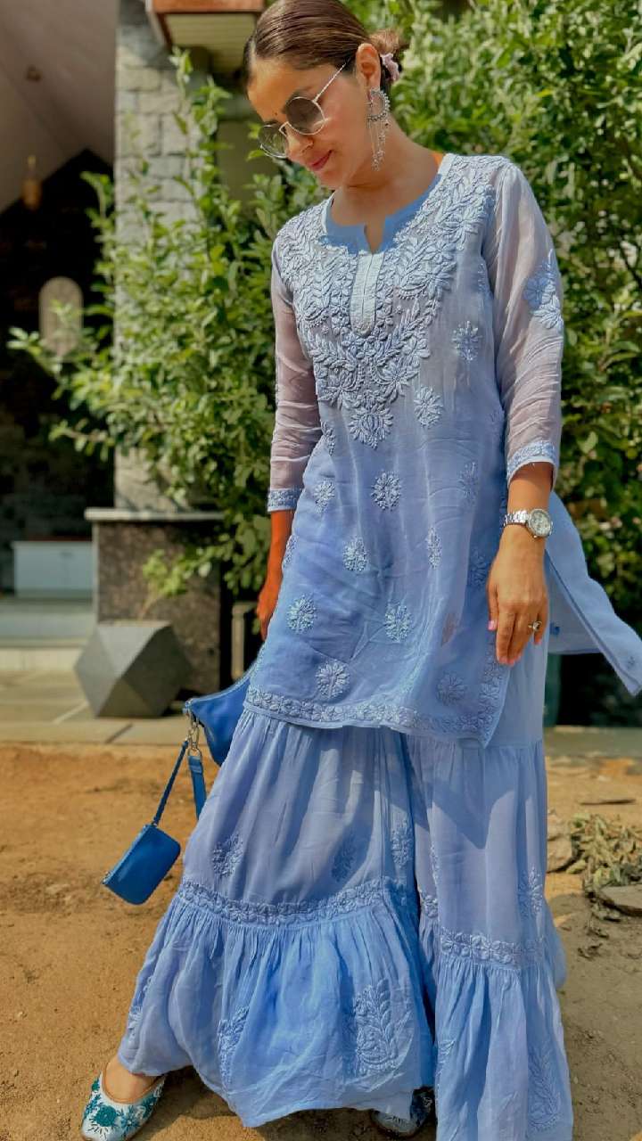 गर्मियों के मौसम में चिकनकारी सूट काफी फैशन में रहते हैं। ऐसे में आप भी इस ब्लू चिकनकारी शरारा सूट से इंस्पिरेशन ले सकती हैं।