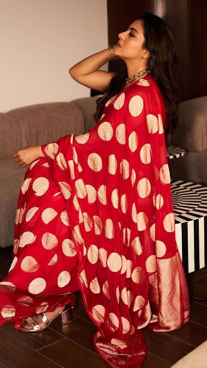डीवा इस रेड पोल्का डॉट साड़ी में बेहद गॉर्जियस दिख रही हैं।