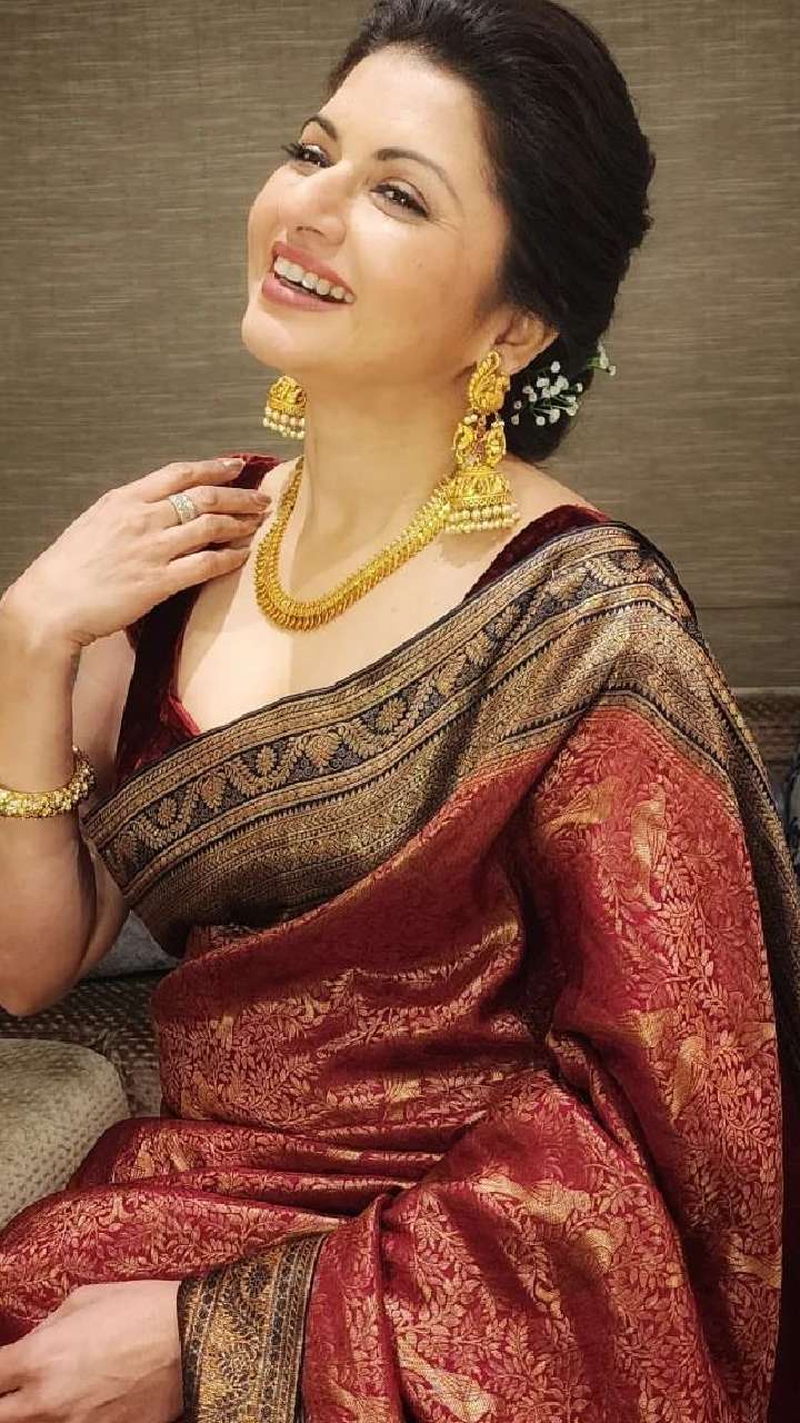 भाग्यश्री का ये रेड एंड ब्लैक बनारसी साड़ी संग गोल्डन ज्वैलरी लुक आप किसी भी वेडिंग फंक्शन में ट्राई कर सकती हैं।