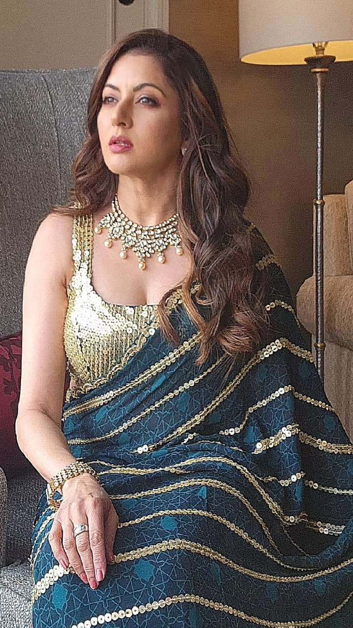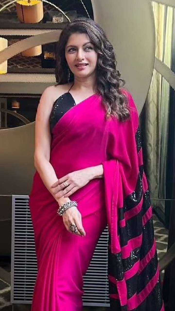 एक्ट्रेस का ये प्लेन साड़ी के साथ कंट्रास्ट कलर शिमरी स्ट्रैपी ब्लाउज लुक स्मार्ट लुक दे रहा है।