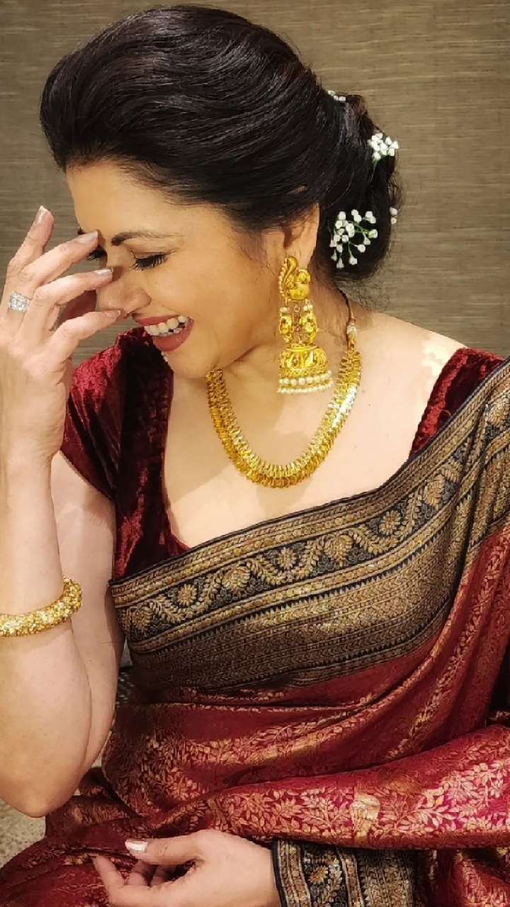 बनारसी साड़ी के साथ एक्ट्रेस का ये वेलवेट मेगा स्लीव्स ब्लाउज भी गजब लग रहा है।