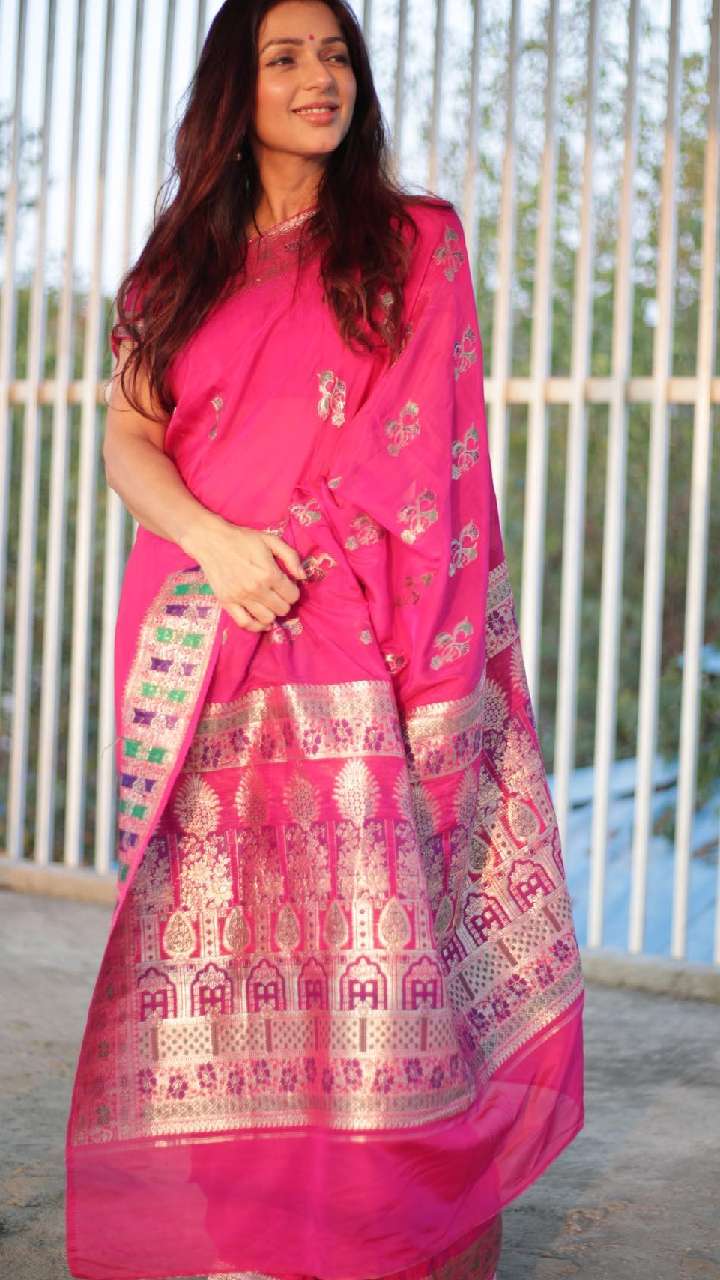 भूमिका चावला के पास साड़ी का भी शानदार कलेक्शन है। पिंक बनारसी साड़ी में भी एक्ट्रेस बहुत खूबसूरत लग रहीं हैं।