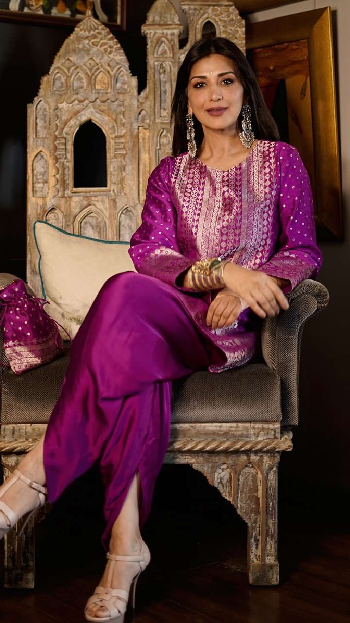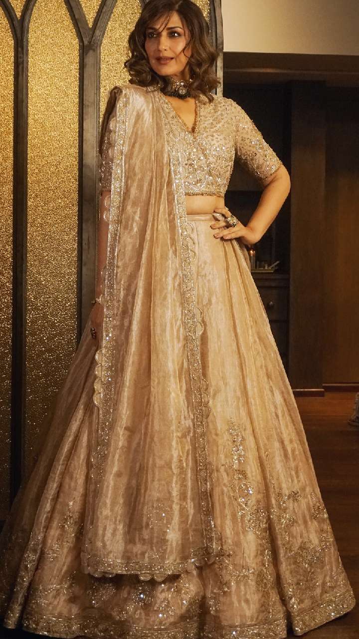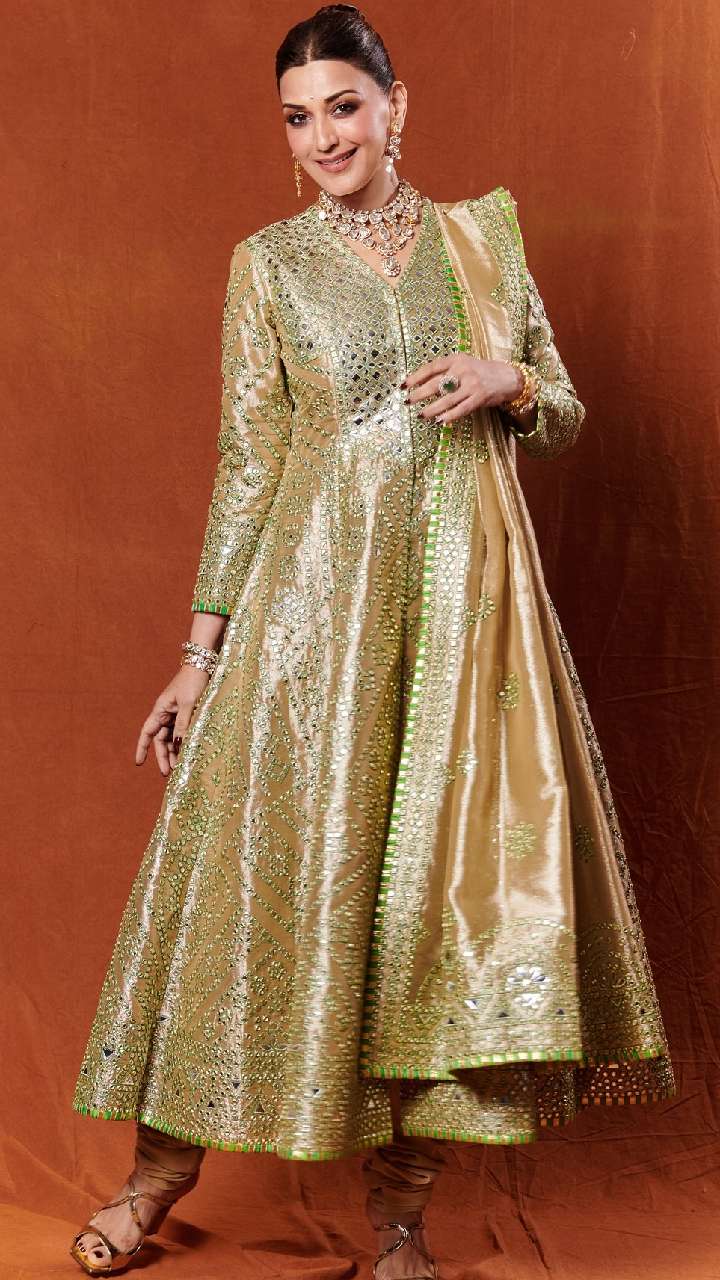 सोनाली बेंद्रे मिरर वर्क सूट में बला की खूबसूरत लग रही हैं। आप भी ऐसे सूट शादी-फंक्शन के लिए चुन सकती हैं।