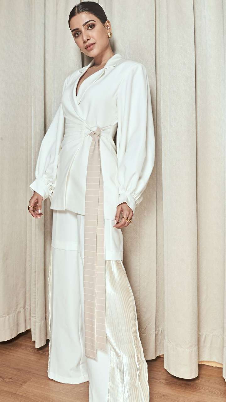 व्हाइट कलर के इस आउटफिट में सामंथा रुथ प्रभु काफी ज्यादा क्लासी लग रहीं हैं। एक्ट्रेस ने इस आउटफिट के साथ जूड़ा बनाया है।