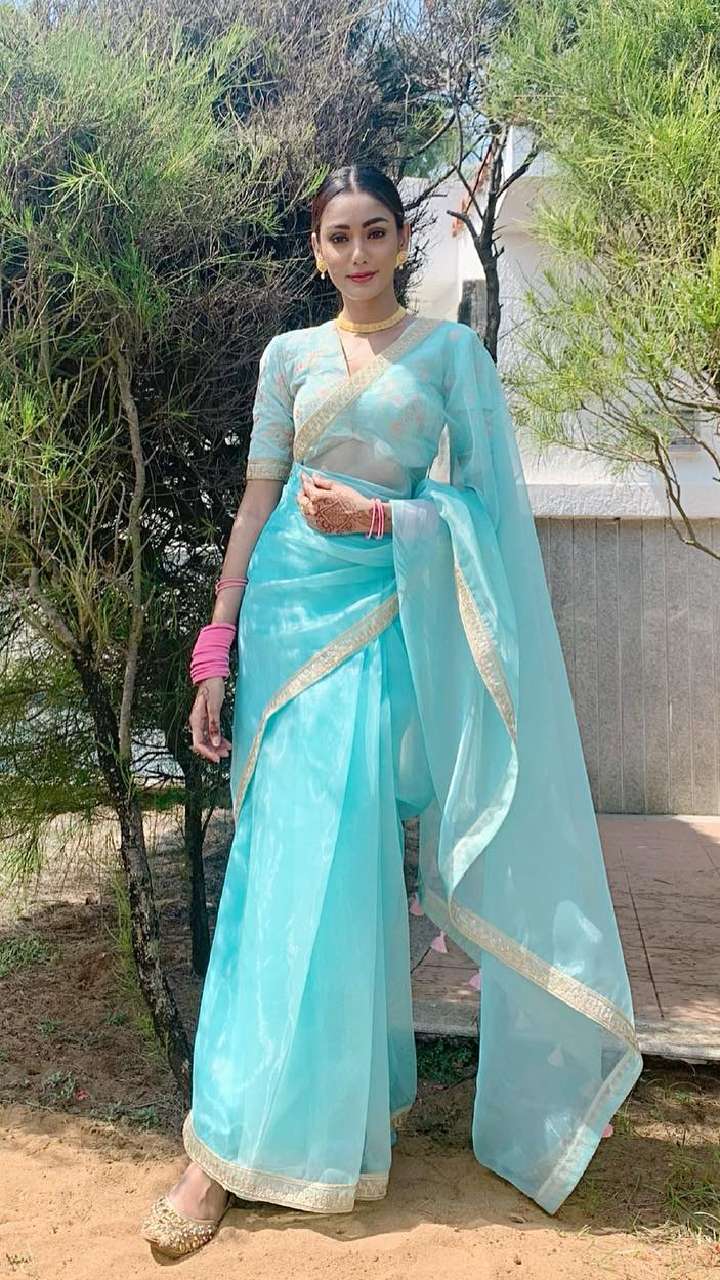 इस पिस्ता ग्रीन साड़ी में सना मकबूल का लुक शानदार लग रहा है। लाइट कलर्स आप गर्मी में कैरी कर सकती हैं।