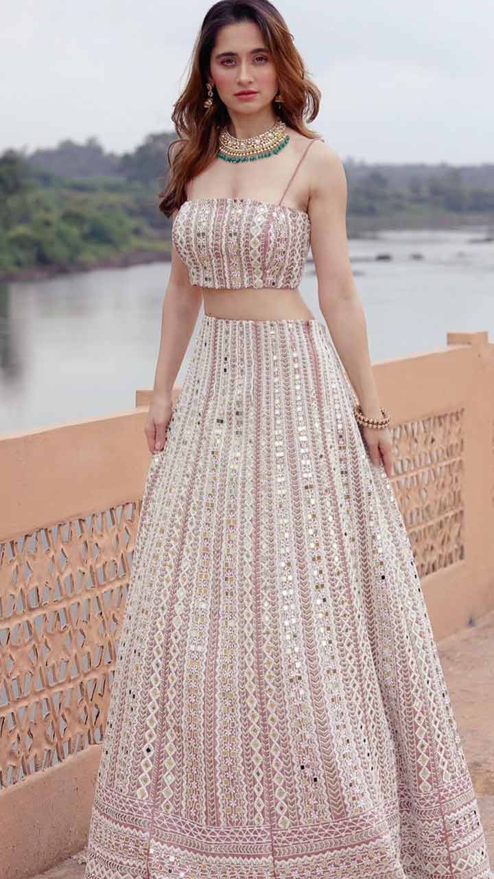 संजीदा शेख इस व्हाइट स्ट्रेपलेस चोली और लहंगे में किसी अप्सरा से कम नहीं लग रही हैं।