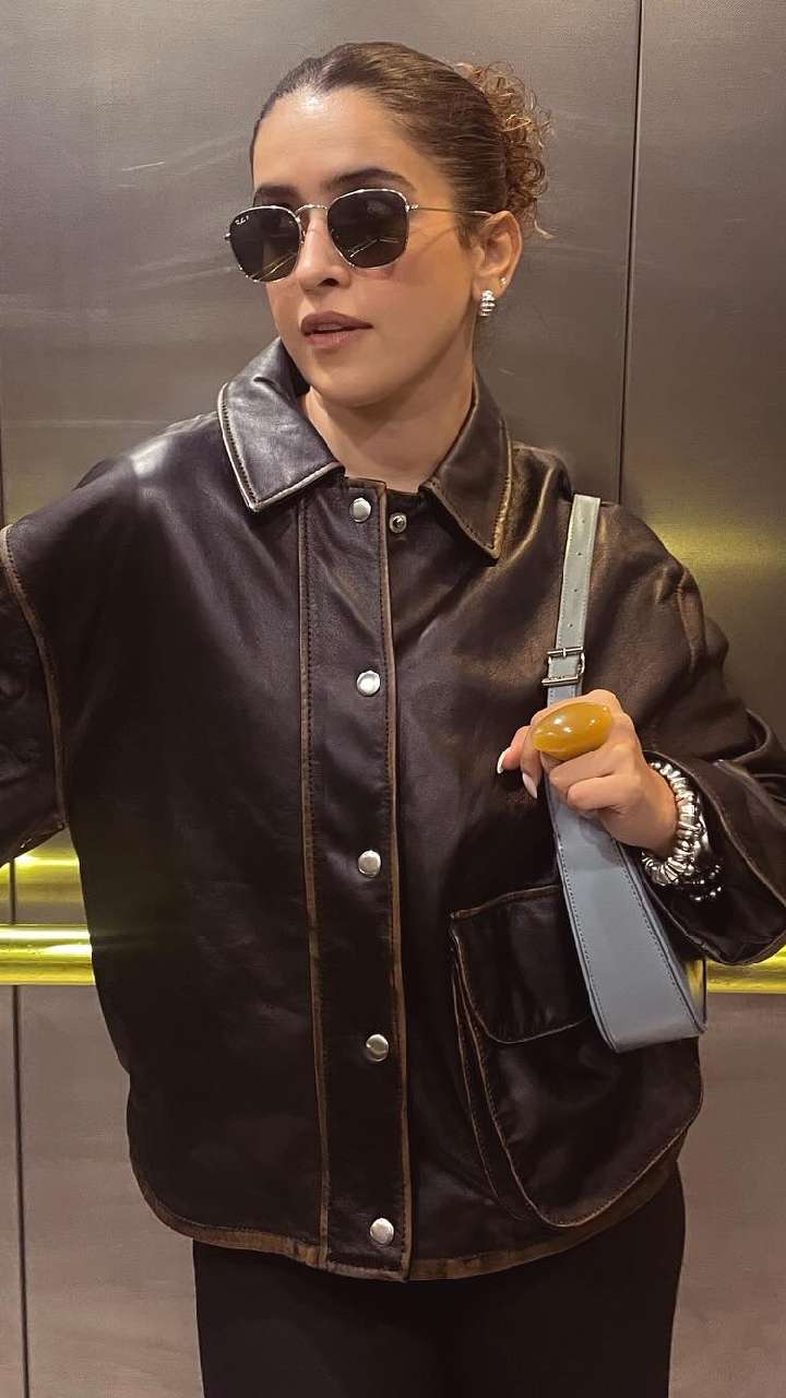 आप एक्ट्रेस की इस ब्राऊन कलर की लेदर जैकेट को ऑफिस इवेंट पर कर्ली हेयर स्टाइल के साथ स्टाइलिश लुक ले सकती हैं।